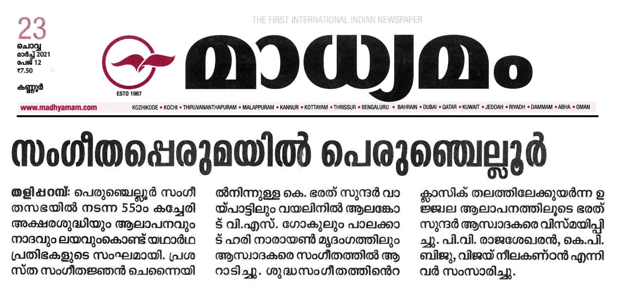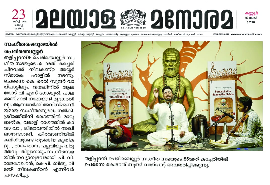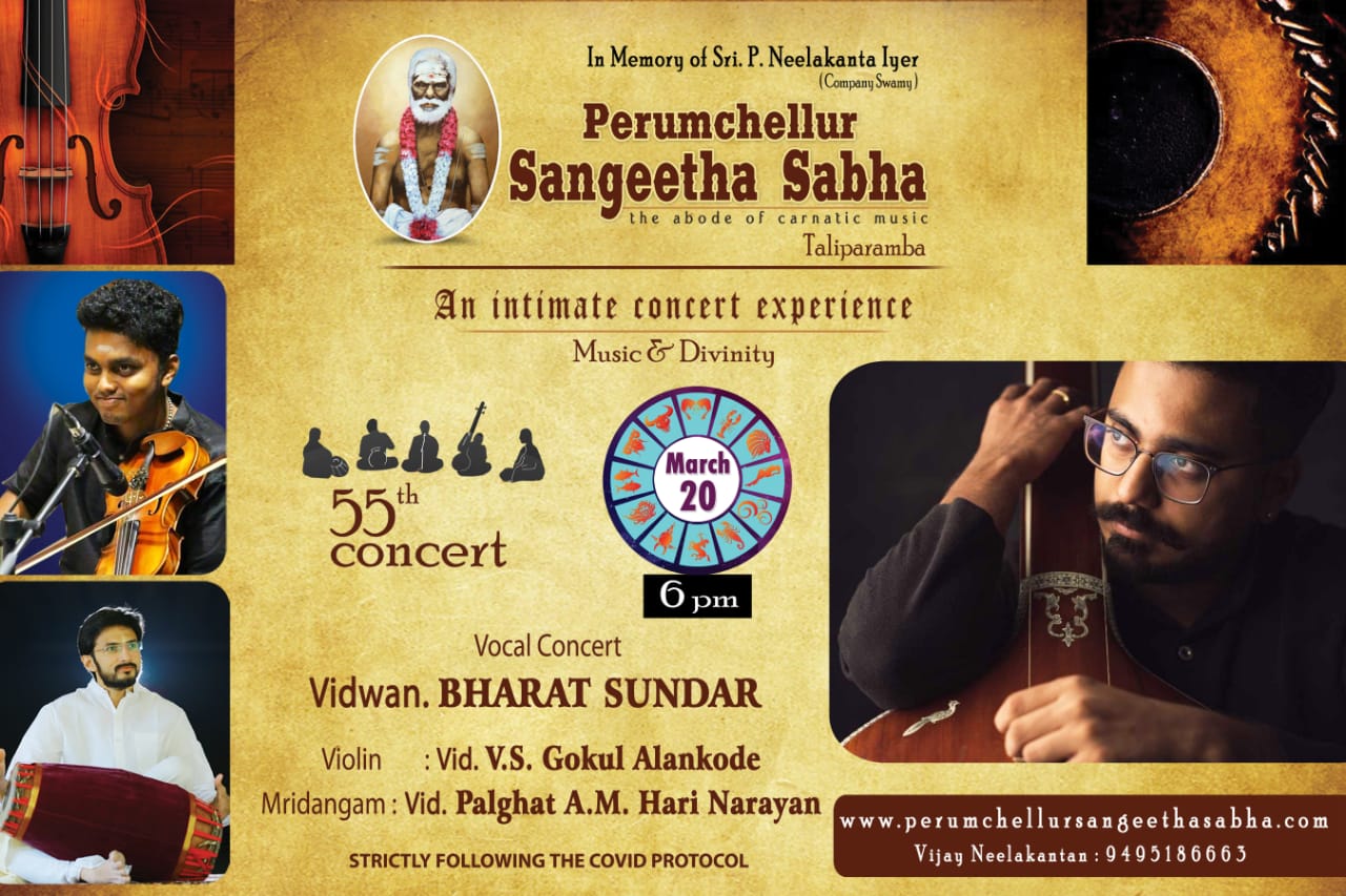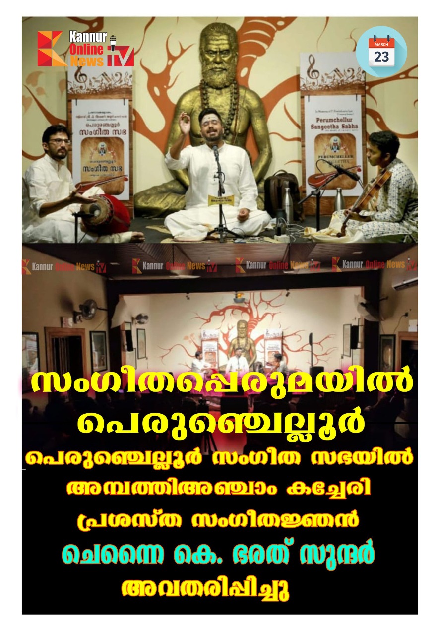 അക്ഷര ശുദ്ധിയും ആലാപനവും നാദവും ലയവും ഒരു പോലെ വശഗതമായ യഥാര്ഥ പ്രതിഭകളുടെ സംഘമായിരുന്നു പെരുഞ്ചെല്ലൂർ സംഗീത സഭയുടെ അമ്പത്തിഅഞ്ചാം കച്ചേരി. പ്രശസ്ത സംഗീതജ്ഞൻ ചെന്നൈയിൽ നിന്നുള്ള കെ. ഭരത് സുന്ദർ വായ്പാട്ടിലും, വയലിനിൽ ആലങ്കോട് വി എസ് ഗോകുൽ, പാലക്കാട് ഹരി നാരായൺ മൃദഗത്തിലും ആസ്വാദകരെ സംഗീതത്തിൽ ആറാടിച്ചു.