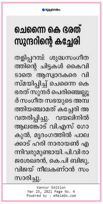 ശുദ്ധസംഗീതത്തിന്റെ ചിട്ടകളിൽ ഉറച്ച് നിന്ന് ഭരത് സുന്ദർ അവതരിപ്പിച്ച കച്ചേരി അക്ഷരാർത്ഥത്തിൽ ആസ്വാദകർ മൂന്ന് മണിക്കൂറെങ്കിലും കോവിഡ് എന്ന മഹാമാരിയെ മറന്ന് സംഗീതത്തിൽ അലിഞ്ഞു ചേർന്നു. പി. വി. രാജശേഖരൻ, ബിജു.കെ. പി, വിജയ് നീലകണ്ഠൻ എന്നിവർ സംസാരിച്ചു.