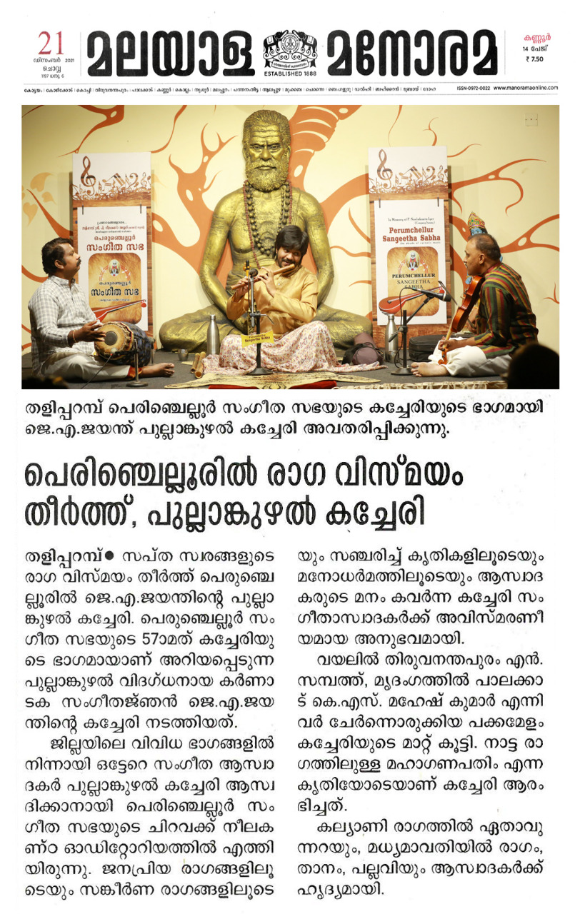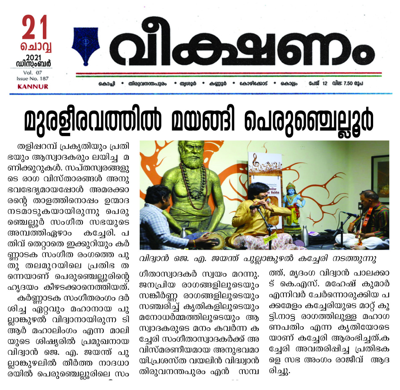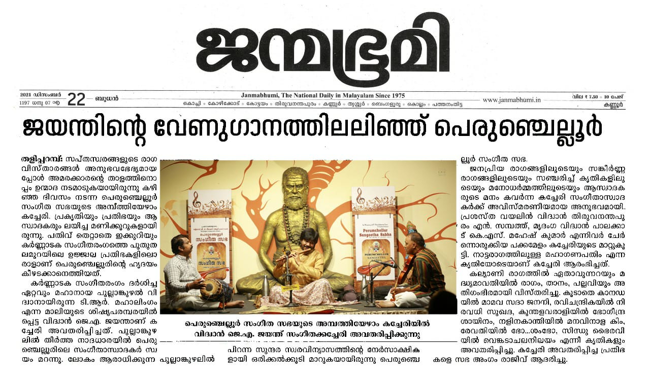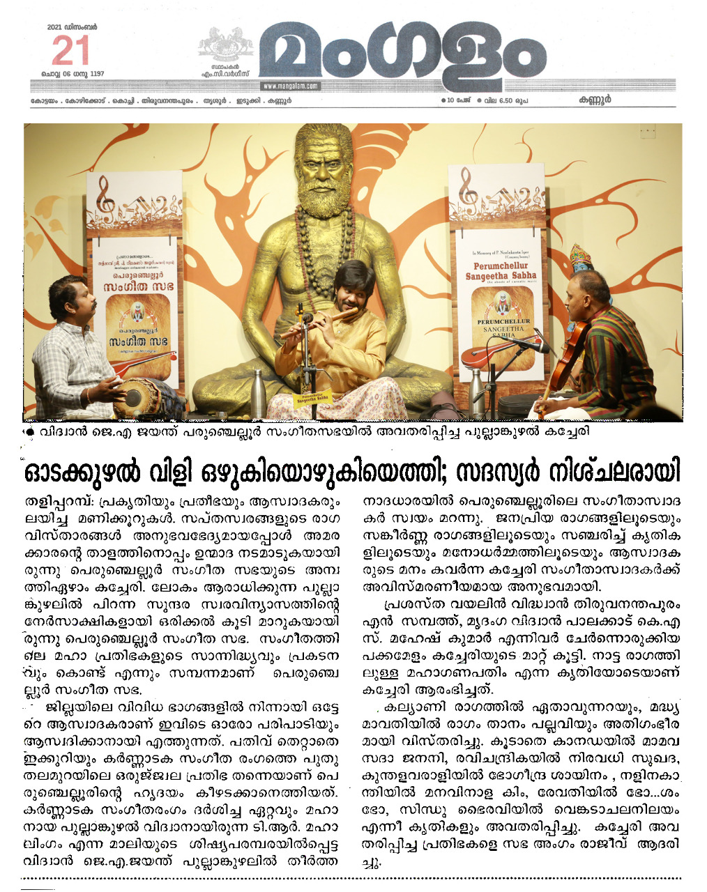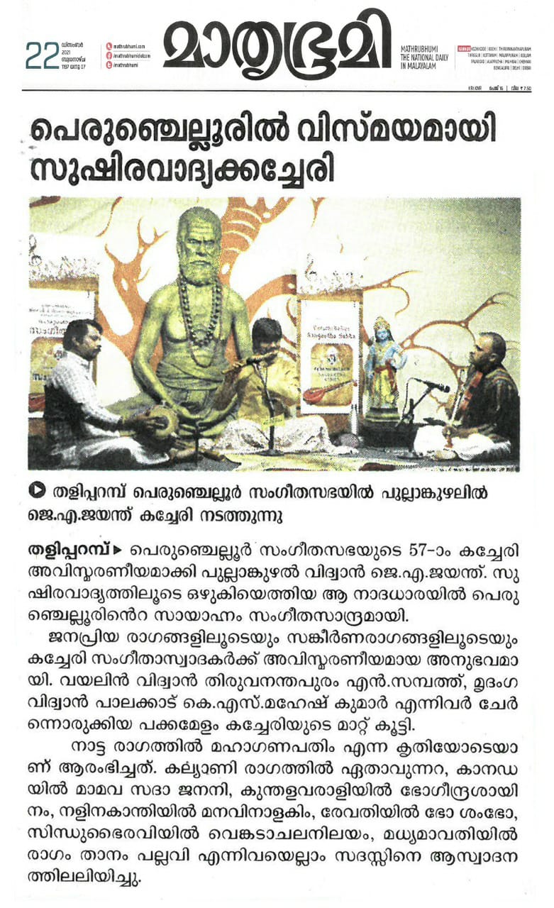 കർണ്ണാടക സംഗീതരംഗം ദർശിച്ച ഏറ്റവും മഹാനായ പുല്ലാങ്കുഴൽ വിദ്വാനായിരുന്ന T. R. മഹാലിംഗം എന്ന മാലിയുടെ ശിഷ്യപരമ്പരയിൽപ്പെട്ട വിദ്വാൻ ശ്രീ ജെ. എ. ജയന്ത് പുല്ലാങ്കുഴലിൽ തീർത്ത നാദധാരയിൽ പെരുഞ്ചെല്ലൂരിലെ സംഗീതാസ്വാദകർ സ്വയം മറന്നു. ജനപ്രിയ രാഗങ്ങളിലൂടെയും സങ്കീർണ്ണ രാഗങ്ങളിലൂടെയും സഞ്ചരിച്ച് കൃതികളിലൂടെയും മനോധർമ്മത്തിലൂടെയും ആസ്വാദകരുടെ മനം കവർന്ന കച്ചേരി സംഗീതാസ്വാദകർക്ക് അവിസ്മരണീയമായ അനുഭവമായി.