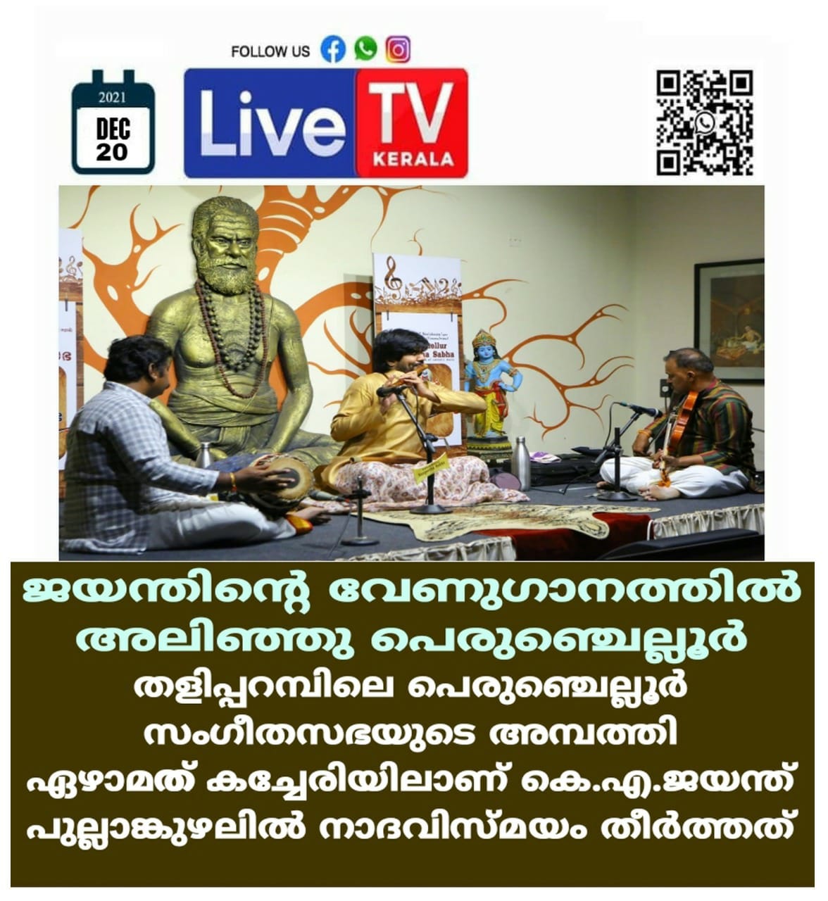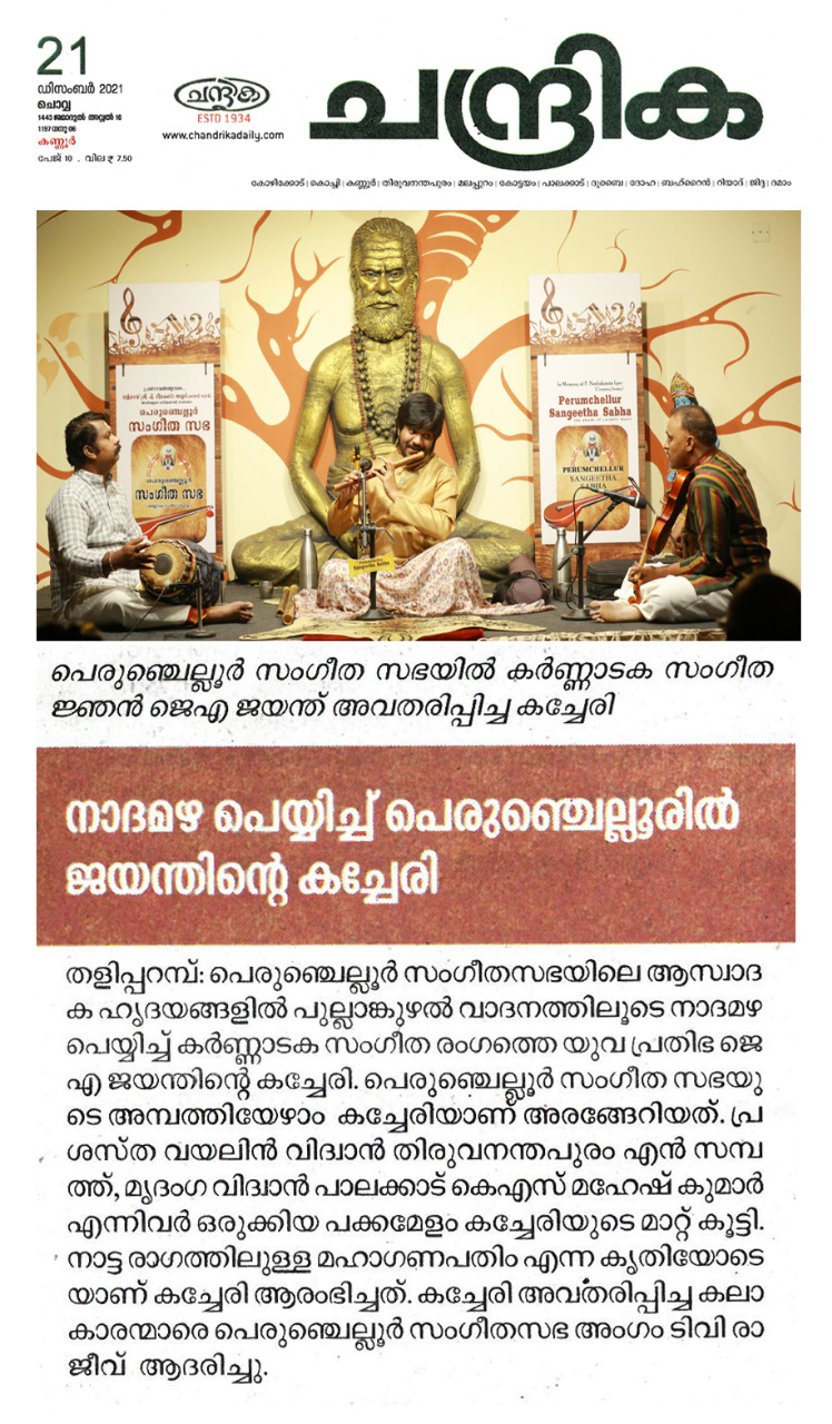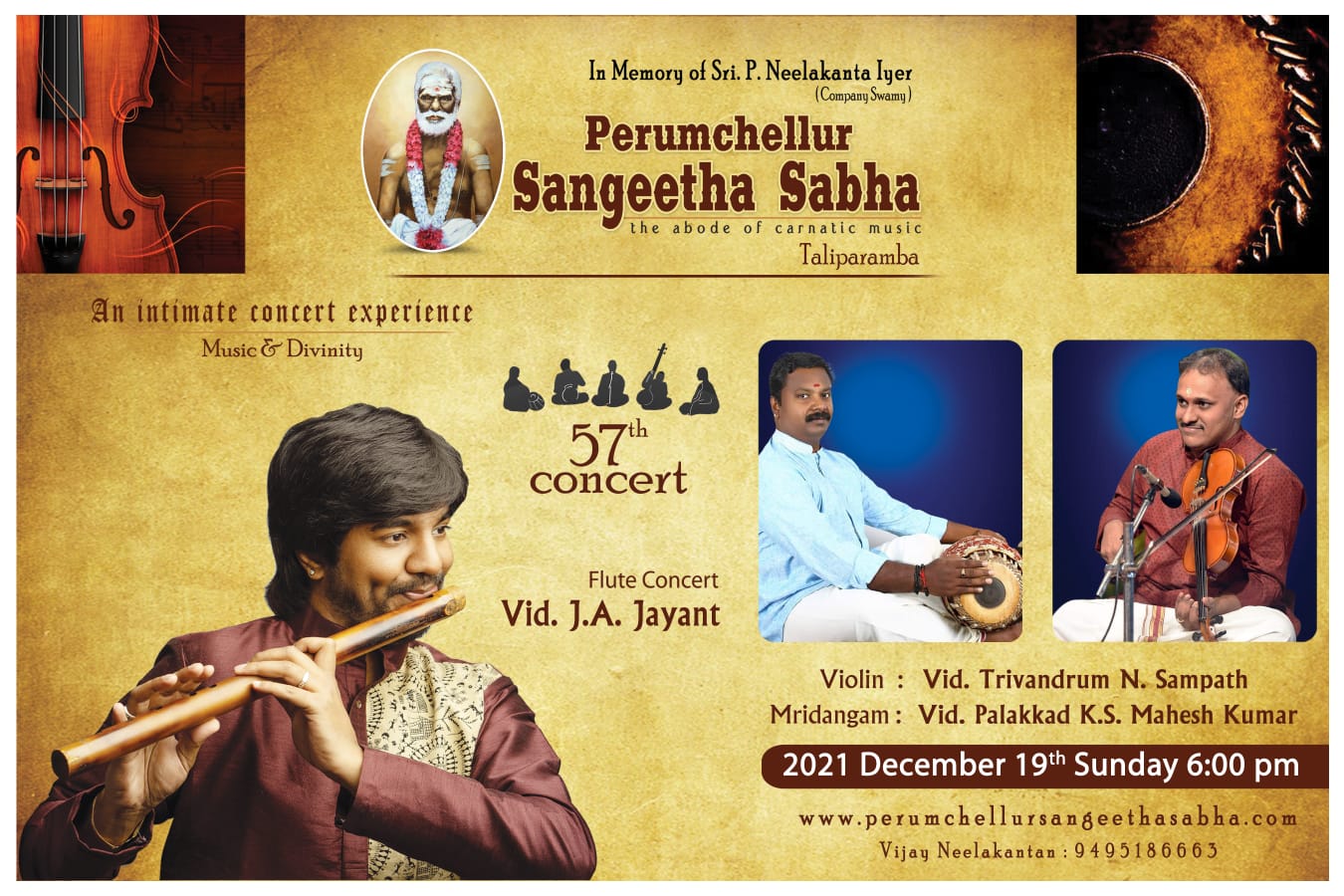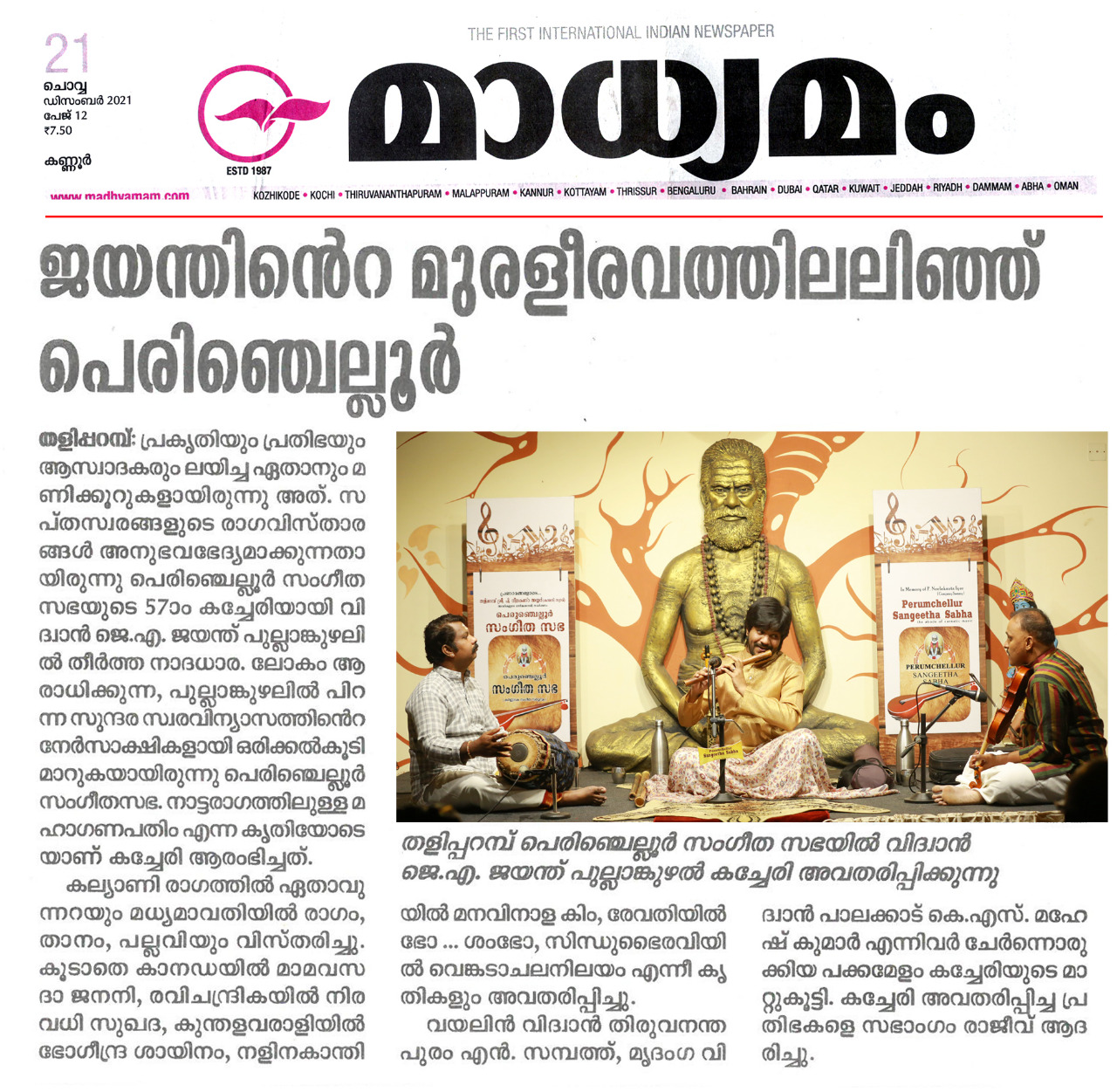 കർണ്ണാടക സംഗീതരംഗം ദർശിച്ച ഏറ്റവും മഹാനായ പുല്ലാങ്കുഴൽ വിദ്വാനായിരുന്ന T. R. മഹാലിംഗം എന്ന മാലിയുടെ ശിഷ്യപരമ്പരയിൽപ്പെട്ട വിദ്വാൻ ശ്രീ ജെ. എ. ജയന്ത് പുല്ലാങ്കുഴലിൽ തീർത്ത നാദധാരയിൽ പെരുഞ്ചെല്ലൂരിലെ സംഗീതാസ്വാദകർ സ്വയം മറന്നു. ജനപ്രിയ രാഗങ്ങളിലൂടെയും സങ്കീർണ്ണ രാഗങ്ങളിലൂടെയും സഞ്ചരിച്ച് കൃതികളിലൂടെയും മനോധർമ്മത്തിലൂടെയും ആസ്വാദകരുടെ മനം കവർന്ന കച്ചേരി സംഗീതാസ്വാദകർക്ക് അവിസ്മരണീയമായ അനുഭവമായി.