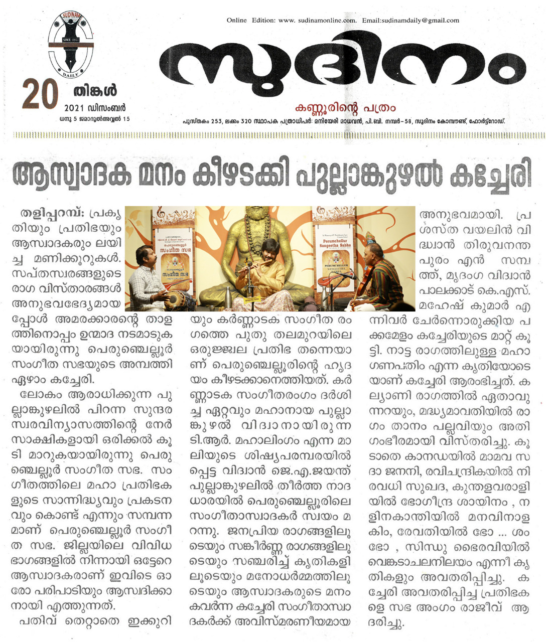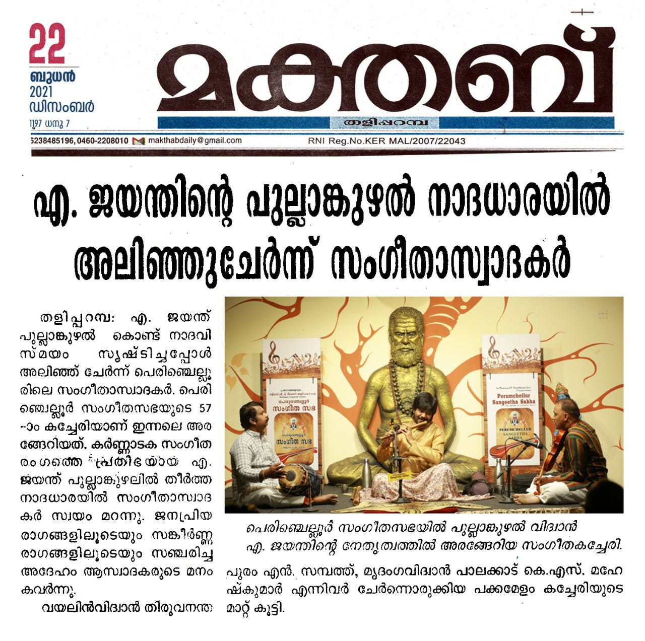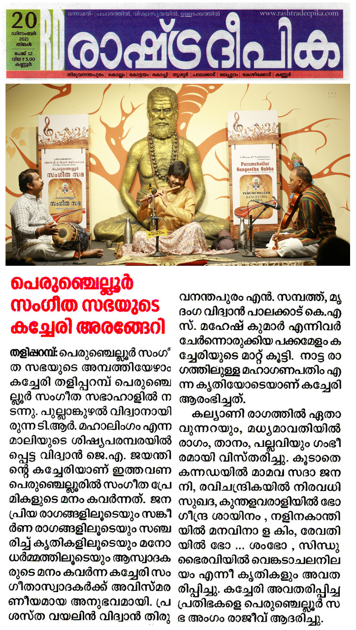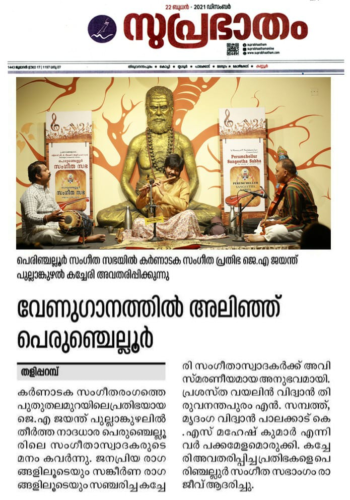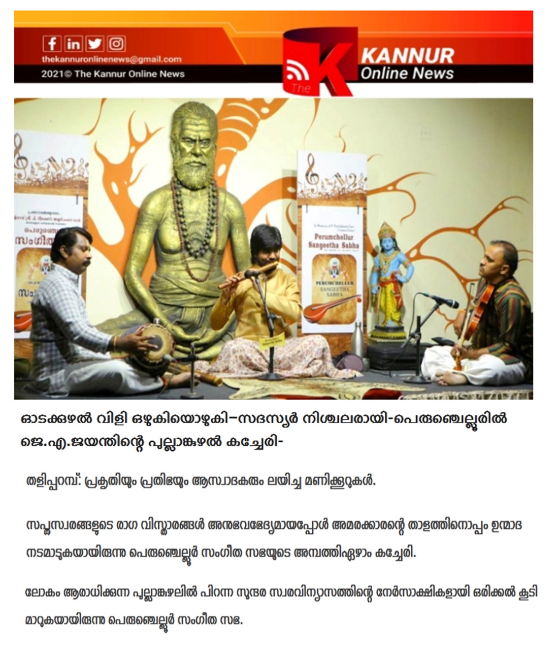 കർണ്ണാടക സംഗീതരംഗം ദർശിച്ച ഏറ്റവും മഹാനായ പുല്ലാങ്കുഴൽ വിദ്വാനായിരുന്ന T. R. മഹാലിംഗം എന്ന മാലിയുടെ ശിഷ്യപരമ്പരയിൽപ്പെട്ട വിദ്വാൻ ശ്രീ ജെ. എ. ജയന്ത് പുല്ലാങ്കുഴലിൽ തീർത്ത നാദധാരയിൽ പെരുഞ്ചെല്ലൂരിലെ സംഗീതാസ്വാദകർ സ്വയം മറന്നു. ജനപ്രിയ രാഗങ്ങളിലൂടെയും സങ്കീർണ്ണ രാഗങ്ങളിലൂടെയും സഞ്ചരിച്ച് കൃതികളിലൂടെയും മനോധർമ്മത്തിലൂടെയും ആസ്വാദകരുടെ മനം കവർന്ന കച്ചേരി സംഗീതാസ്വാദകർക്ക് അവിസ്മരണീയമായ അനുഭവമായി.