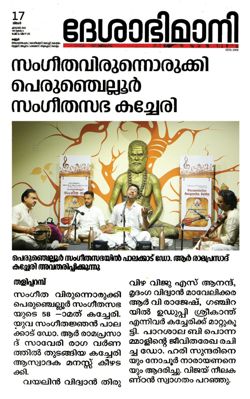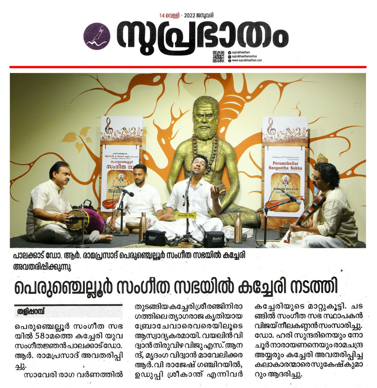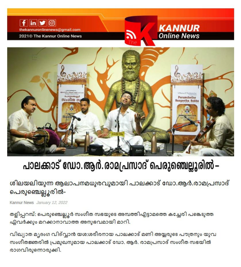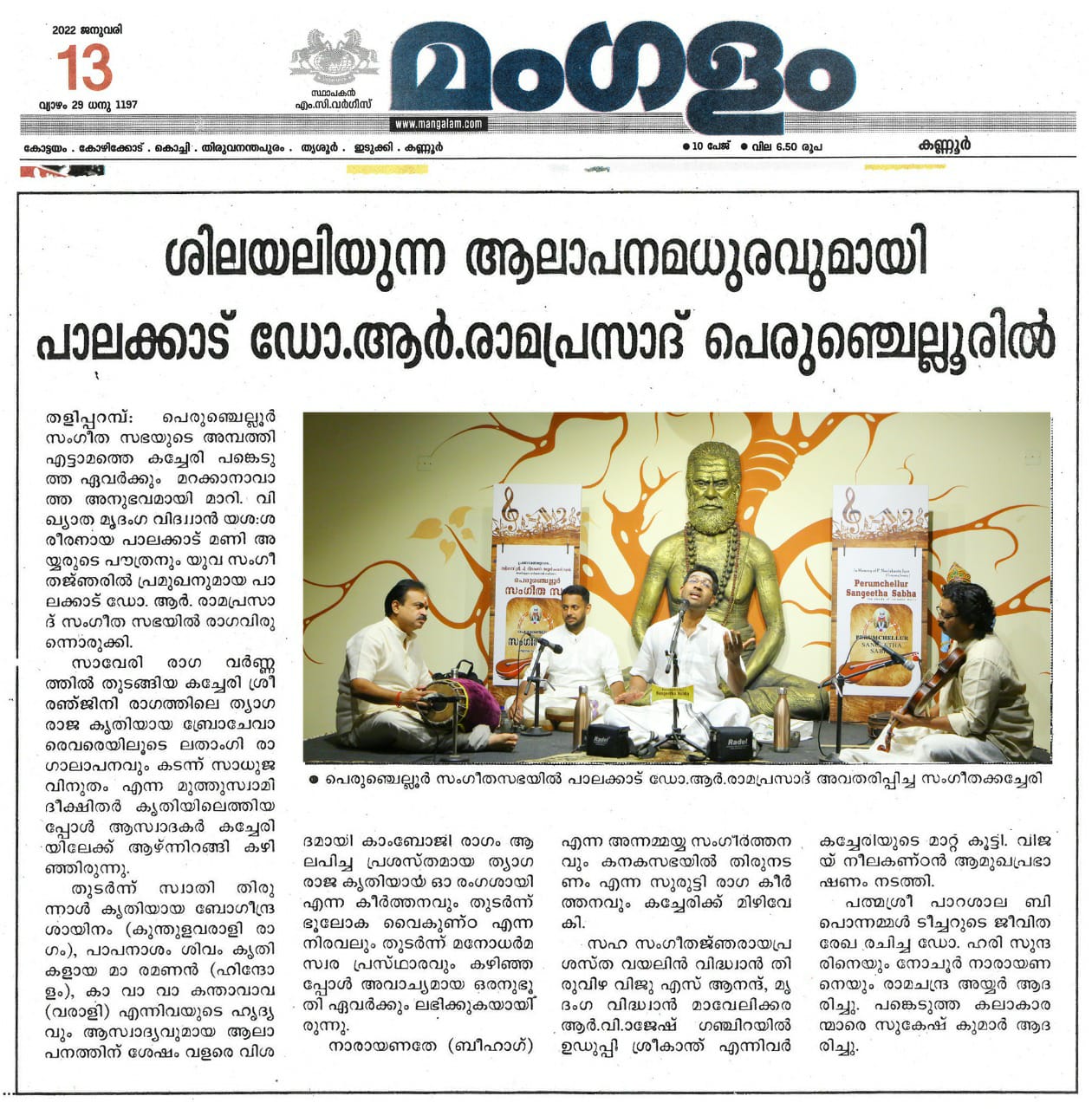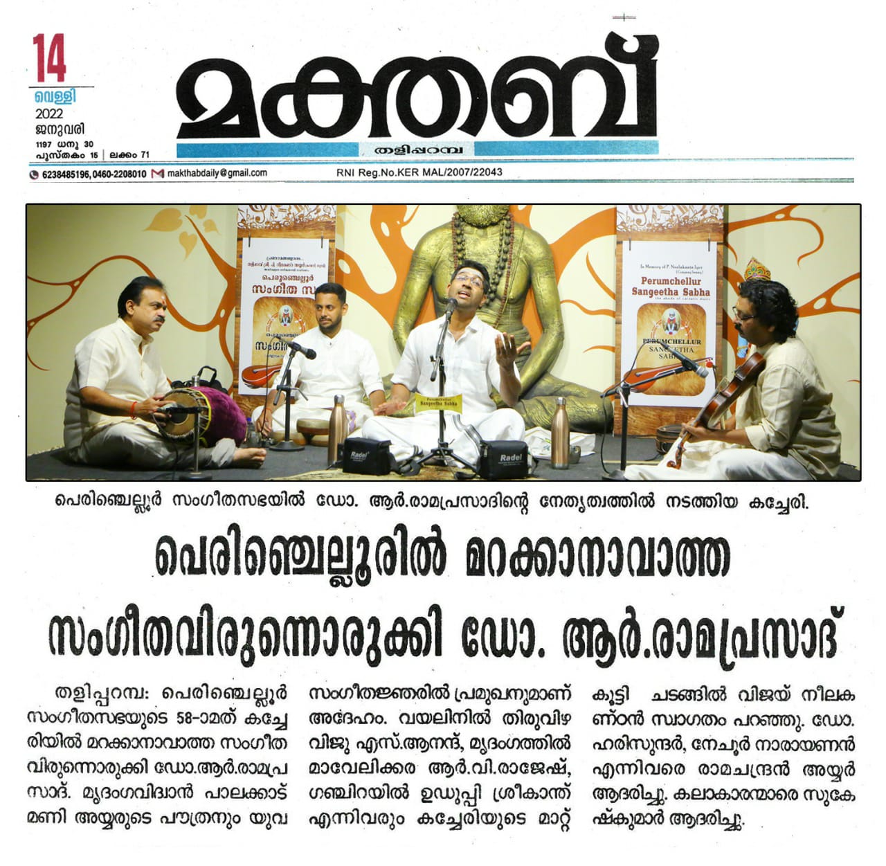 പെരുഞ്ചെല്ലൂർ സംഗീത പാരമ്പര്യത്തിന് മറ്റൊരു സുവർണ്ണ ദിനം തളിപ്പറമ്പ : പെരുഞ്ചെല്ലൂർ സംഗീത സഭയുടെ അമ്പത്തി എട്ടാമത്തെ കച്ചേരി പങ്കെടുത്ത ഏവർക്കും തീർത്തും ആസ്വാദ്യകരമായിരുന്നു. വിഖ്യാത മൃദംഗ വിദ്ധ്വാൻ യശ:ശരീരനായ പാലക്കാട് മണി അയ്യരുടെ പൗത്രനും യുവ സംഗീതജ്ഞരിൽ പ്രമുഖനുമായ പാലക്കാട് ഡോ. ആർ. രാമപ്രസാദ് സംഗീത സഭയിൽ മറക്കാനാവാത്ത വിരുന്നൊരുക്കി. സാവേരി രാഗ വർണ്ണത്തിൽ തുടങ്ങിയ കച്ചേരി ശ്രീ രഞ്ജിനി രാഗത്തിലെ ത്യാഗരാജ കൃതിയായ ബ്രോചേവാരെവരെയിലൂടെ ലതാംഗി രാഗാലാപനവും കടന്ന് സാധുജവിനുതം എന്ന മുത്തുസ്വാമി ദീക്ഷിതർ കൃതിയിലെത്തിയപ്പോൾ ആസ്വാദകർ കച്ചേരിയിലേക്ക് ആഴ്ന്നിറങ്ങി കഴിഞ്ഞിരുന്നു. തുടർന്ന് സ്വാതി തിരുന്നാൾ കൃതിയായ ബോഗീന്ദ്രശായിനം (കുന്തുളവരാളി രാഗം), പാപനാശം ശിവം കൃതികളായ മാ രമണൻ (ഹിന്ദോളം), കാ വാ വാ കന്താവാവ (വരാളി) എന്നിവയുടെ ഹൃദ്യവും ആസ്വാദ്യവുമായ ആലാപനത്തിന് ശേഷം വളരെ വിശദമായി കാംബോജി രാഗം ആലപിച്ച പ്രശസ്തമായ ത്യാഗരാജ കൃതിയായ ഓ രംഗശായി എന്ന കീർത്തനവും തുടർന്ന് ഭൂലോക വൈകുണ്ഠ എന്ന നിരവലും തുടർന്ന് മനോധർമ സ്വര പ്രസ്ഥാരവും കഴിഞ്ഞപ്പോൾ അവാച്യമായ ഒരനുഭൂതി ഏവർക്കും ലഭിക്കുകയായിരുന്നു. നാരായണതേ (ബീഹാഗ്) എന്ന അന്നമ്മയ്യ സംഗീർത്തനവും കനകസഭയിൽ തിരുനടണം എന്ന സുരുട്ടി രാഗ കീർത്തനവും കച്ചേരിക്ക് മിഴിവേകി. സഹ സംഗീതജ്ഞരായപ്രശസ്ത വയലിൻ വിദ്ധ്വാൻ തിരുവിഴ വിജു എസ് ആനന്ദ്, മൃദംഗ വിദ്ധ്വാൻ മാവേലിക്കര ആർ വി രാജേഷ് ഗഞ്ചിറയിൽ ഉഡുപ്പി ശ്രീകാന്ത് എന്നിവർ കച്ചേരിയുടെ മാറ്റ് കൂട്ടി. വിജയ് നീലകണ്ഠൻ സ്വാഗതമാശംസിച്ചു. പത്മശ്രീ പാറശാല ബി പൊന്നമ്മൾ ടീച്ചറുടെ ജീവിത രേഖ രചിച്ച ഡോ. ഹരി സുന്ദരിനെയും നോചൂർ നാരായണൻ അവർകളെയും രാമചന്ദ്ര അയ്യർ ആദരിച്ചു. കലാകാരന്മാരെ സുകേഷ് കുമാർ ആദരിച്ചു.