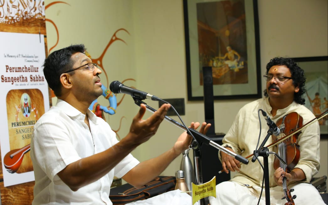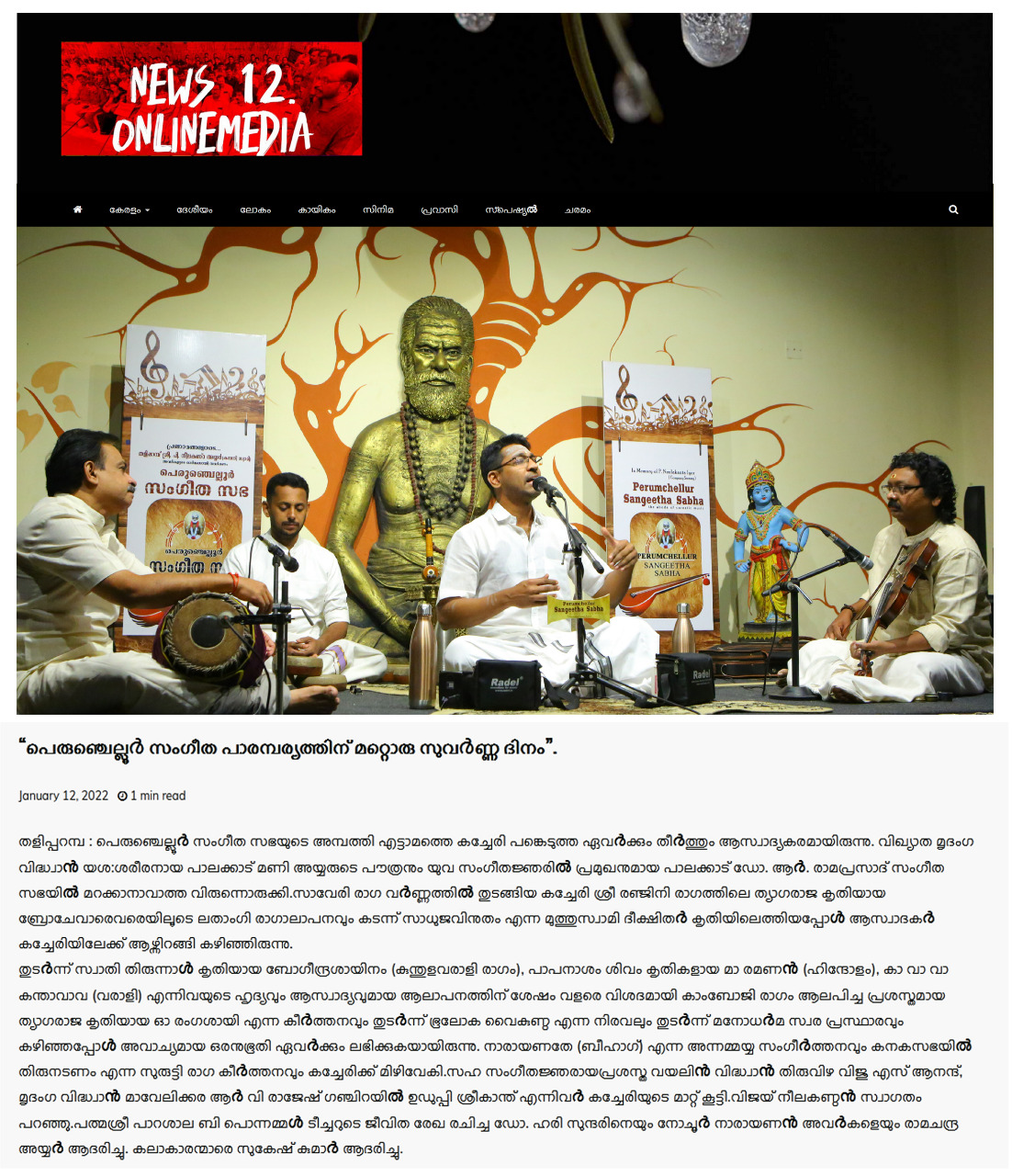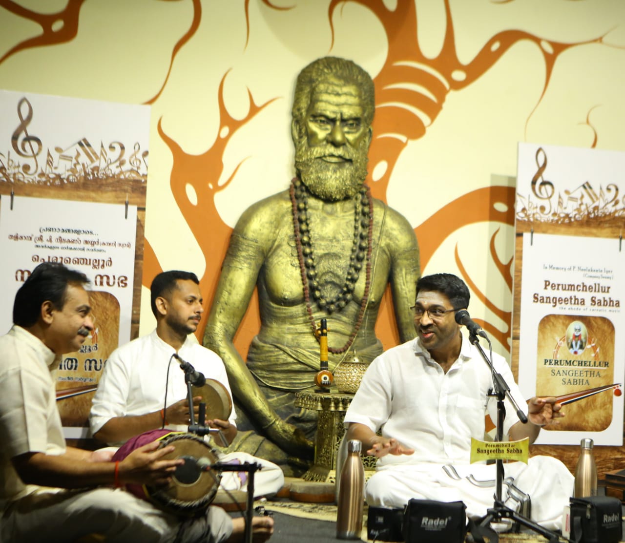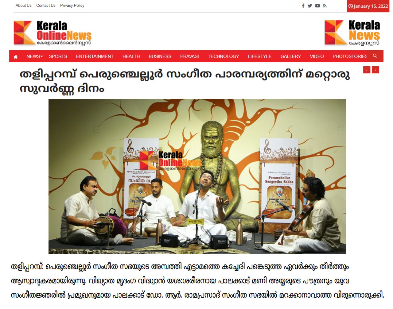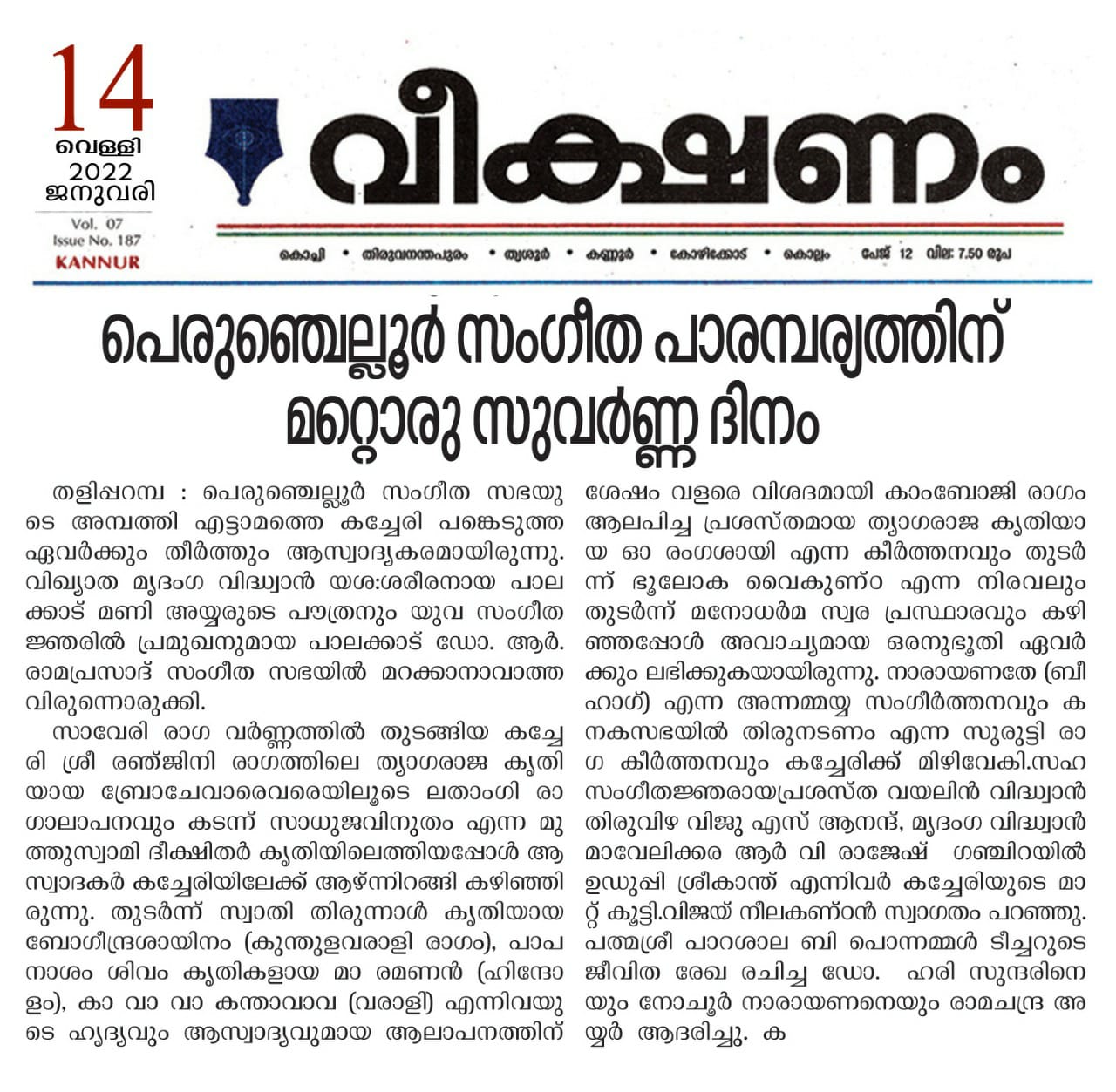 പെരുഞ്ചെല്ലൂർ സംഗീത പാരമ്പര്യത്തിന് മറ്റൊരു സുവർണ്ണ ദിനം തളിപ്പറമ്പ : പെരുഞ്ചെല്ലൂർ സംഗീത സഭയുടെ അമ്പത്തി എട്ടാമത്തെ കച്ചേരി പങ്കെടുത്ത ഏവർക്കും തീർത്തും ആസ്വാദ്യകരമായിരുന്നു. വിഖ്യാത മൃദംഗ വിദ്ധ്വാൻ യശ:ശരീരനായ പാലക്കാട് മണി അയ്യരുടെ പൗത്രനും യുവ സംഗീതജ്ഞരിൽ പ്രമുഖനുമായ പാലക്കാട് ഡോ. ആർ. രാമപ്രസാദ് സംഗീത സഭയിൽ മറക്കാനാവാത്ത വിരുന്നൊരുക്കി. സാവേരി രാഗ വർണ്ണത്തിൽ തുടങ്ങിയ കച്ചേരി ശ്രീ രഞ്ജിനി രാഗത്തിലെ ത്യാഗരാജ കൃതിയായ ബ്രോചേവാരെവരെയിലൂടെ ലതാംഗി രാഗാലാപനവും കടന്ന് സാധുജവിനുതം എന്ന മുത്തുസ്വാമി ദീക്ഷിതർ കൃതിയിലെത്തിയപ്പോൾ ആസ്വാദകർ കച്ചേരിയിലേക്ക് ആഴ്ന്നിറങ്ങി കഴിഞ്ഞിരുന്നു. തുടർന്ന് സ്വാതി തിരുന്നാൾ കൃതിയായ ബോഗീന്ദ്രശായിനം (കുന്തുളവരാളി രാഗം), പാപനാശം ശിവം കൃതികളായ മാ രമണൻ (ഹിന്ദോളം), കാ വാ വാ കന്താവാവ (വരാളി) എന്നിവയുടെ ഹൃദ്യവും ആസ്വാദ്യവുമായ ആലാപനത്തിന് ശേഷം വളരെ വിശദമായി കാംബോജി രാഗം ആലപിച്ച പ്രശസ്തമായ ത്യാഗരാജ കൃതിയായ ഓ രംഗശായി എന്ന കീർത്തനവും തുടർന്ന് ഭൂലോക വൈകുണ്ഠ എന്ന നിരവലും തുടർന്ന് മനോധർമ സ്വര പ്രസ്ഥാരവും കഴിഞ്ഞപ്പോൾ അവാച്യമായ ഒരനുഭൂതി ഏവർക്കും ലഭിക്കുകയായിരുന്നു. നാരായണതേ (ബീഹാഗ്) എന്ന അന്നമ്മയ്യ സംഗീർത്തനവും കനകസഭയിൽ തിരുനടണം എന്ന സുരുട്ടി രാഗ കീർത്തനവും കച്ചേരിക്ക് മിഴിവേകി. സഹ സംഗീതജ്ഞരായപ്രശസ്ത വയലിൻ വിദ്ധ്വാൻ തിരുവിഴ വിജു എസ് ആനന്ദ്, മൃദംഗ വിദ്ധ്വാൻ മാവേലിക്കര ആർ വി രാജേഷ് ഗഞ്ചിറയിൽ ഉഡുപ്പി ശ്രീകാന്ത് എന്നിവർ കച്ചേരിയുടെ മാറ്റ് കൂട്ടി. വിജയ് നീലകണ്ഠൻ സ്വാഗതമാശംസിച്ചു. പത്മശ്രീ പാറശാല ബി പൊന്നമ്മൾ ടീച്ചറുടെ ജീവിത രേഖ രചിച്ച ഡോ. ഹരി സുന്ദരിനെയും നോചൂർ നാരായണൻ അവർകളെയും രാമചന്ദ്ര അയ്യർ ആദരിച്ചു. കലാകാരന്മാരെ സുകേഷ് കുമാർ ആദരിച്ചു.