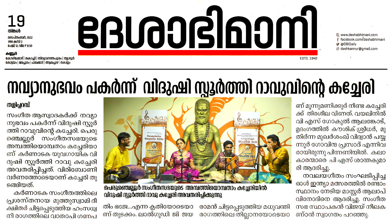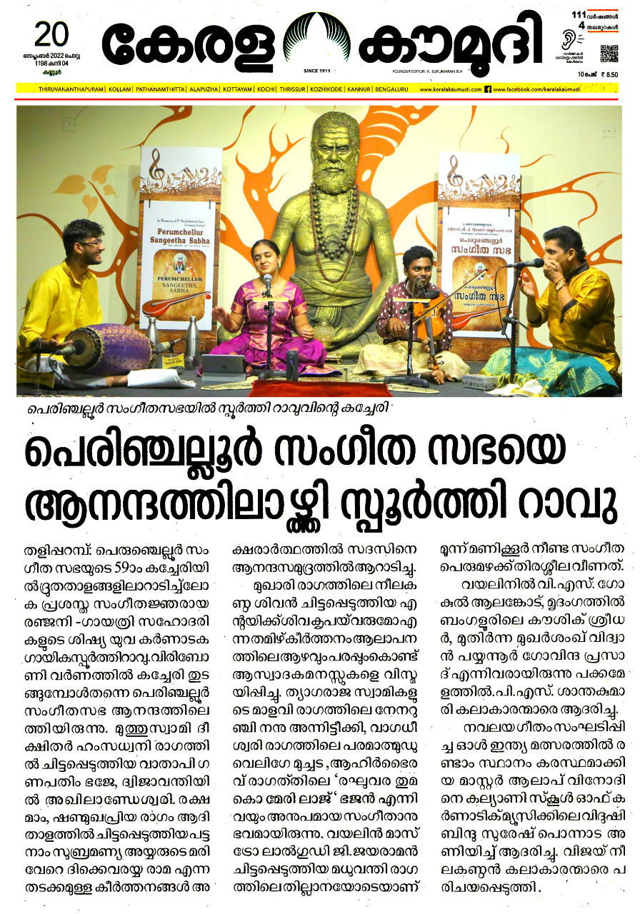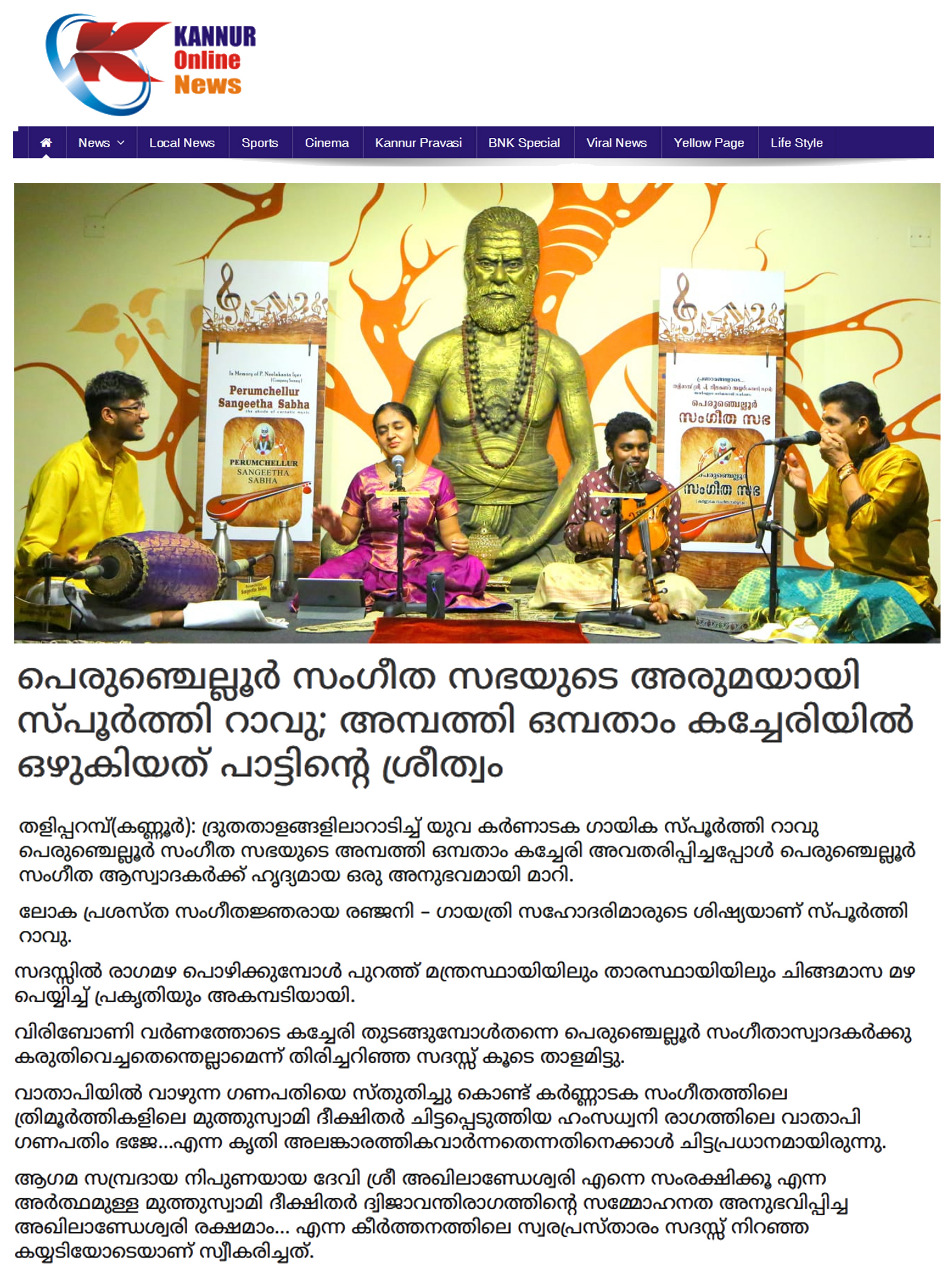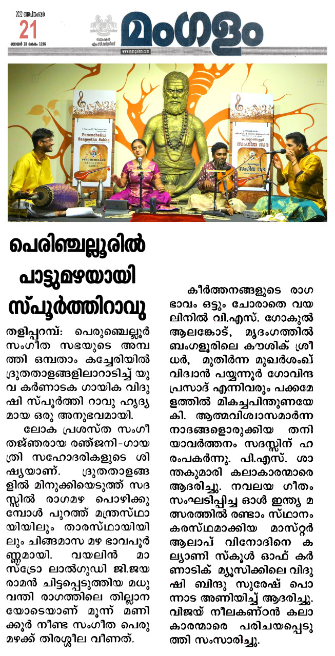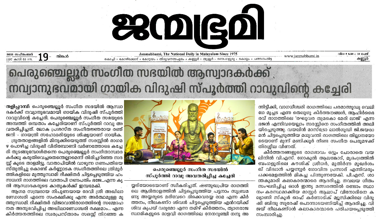 പെരുഞ്ചെല്ലൂർ സംഗീത സഭയുടെ അമ്പത്തി ഒമ്പതാം കച്ചേരി ദ്രുതതാളങ്ങളിലാറാടിച്ച് യുവ കർണാടക ഗായിക വിദുഷി സ്പൂർത്തി റാവു ഹൃദ്യമായ ഒരു അനുഭവമായി പെരുഞ്ചെല്ലൂർ സംഗീത ആസ്വാദകർക്ക് . ലോക പ്രശസ്ത സംഗീതജ്ഞരായ രഞ്ജനി - ഗായത്രി സഹോദരിയുടെ ശിഷ്യയാണ് . ദ്രുതതാളങ്ങളില് മിനുക്കിയെടുത്ത് സദസ്സില് രാഗമഴ പൊഴിക്കുമ്പോള് പുറത്ത് മന്ത്രസ്ഥായിയിലും താരസ്ഥായിയിലും ചിങ്ങമാസ മഴ ഭാവപൂർണ്ണമായി. വിരിബോണി വര്ണത്തോടെ കച്ചേരി തുടങ്ങുമ്പോള്തന്നെ പെരുഞ്ചെല്ലൂർ സംഗീതാസ്വാദകർക്കു കരുതിവെച്ചതെന്തെല്ലാമെന്ന് തിരിച്ചറിഞ്ഞ സദസ്സ് കൂടെ താളമിട്ടു. വാതാപിയിൽ വാഴുന്ന ഗണപതിയെ സ്തുതിച്ചു കൊണ്ട് കർണ്ണാടക സംഗീതത്തിലെ ത്രിമൂർത്തികളിലെ മുത്തുസ്വാമി ദീക്ഷിതർ ചിട്ടപ്പെടുത്തിയ ഹംസധ്വനി രാഗത്തിലെ വാതാപി ഗണപതിം ഭജേ...എന്ന കൃതി അലങ്കാരത്തികവാര്ന്നതെന്നതിനെക്കാള് ചിട്ടപ്രധാനമായിരുന്നു. ആഗമ സമ്പ്രദായ നിപുണയായ ദേവി ശ്രീ അഖിലാണ്ഡേശ്വരി എന്നെ സംരക്ഷിക്കൂ എന്ന അർത്ഥമുള്ള , മുത്തുസ്വാമി ദീക്ഷിതർ ദ്വിജാവന്തിരാഗത്തിന്റെ സമ്മോഹനത അനുഭവിപ്പിച്ച അഖിലാണ്ഡേശ്വരി രക്ഷമാം... എന്ന കീര്ത്തനത്തിലെ സ്വരപ്രസ്താരം സദസ്സ് നിറഞ്ഞ കയ്യടിയോടെയാണ് സ്വീകരിച്ചത്. ഷണ്മുഖപ്രിയ രാഗത്തിലെ ആദി താളത്തിൽ ചിട്ടപ്പെടുത്തിയ പട്ടനാം സുബ്രമണ്യ അയ്യരുടെ മരിവേറെ ദിക്കെവരയ്യ രാമ എന്ന കീർത്തനം ഏറെ മനോരഞ്ജകമായി . സാഹിത്യത്തിലെ സ്ഫുടതയും ഭാവാത്മകതയും തിളക്കംനല്കി. ഒറ്റയടിക്ക് ദുഃഖം നിറഞ്ഞ മനസ്സിൽ ഒരു സചേതനമായ സ്വരമുയർത്തുകയും ഒരേസമയം ഒരു ആശ്വാസം നൽകുകയും ചെയ്യുന്ന മുഖാരി രാഗത്തിലെ നീലകണ്ഠ ശിവൻ ചിട്ടപ്പെടുത്തിയ എൻറയിക്ക് ശിവ കൃപയ് വരുമോ എന്ന തമിഴ് കീർത്തനം ആലാപനത്തിലെ ആഴവും പരപ്പുംകൊണ്ട് ആസ്വാദകമനസ്സുകളെ വിസ്മയിപ്പിച്ചു. ത്യാഗരാജ സ്വാമികളുടെ മാളവി രാഗത്തിലെ നേനറുഞ്ചി നനു അന്നിട്ടീക്കി, വാഗധീശ്വരി രാഗത്തിലെ പരമാത്മുഡു വെലിഗേ മുച്ചട എന്ന തെലുഗു കീർത്തനങ്ങൾ ഭാവസമ്പുഷ്ടവും പ്രസന്നവുമായ ആലാപനത്തിലൂടെ സദസ്സിനെ അലിയിച്ചെടുത്തു. ആഹിർഭൈരവ് രാഗത്തിലെ 'രഘുവര തുമകൊ മേരി ലാജ് ' എന്ന ഭജൻ കേള്വിക്ക് ശീതളാനുഭവം പകരുന്നതായിരുന്നു . വയലിൻ മാസ്ട്രോ ലാൽഗുഡി ജി.ജയരാമൻ ചിട്ടപ്പെടുത്തിയ മധുവന്തി രാഗത്തിലെ തില്ലാനയോടെയാണ് മൂന്ന് മണിക്കൂർ നീണ്ട സംഗീത പെരുമഴക്ക് തിരശ്ശീല വീണത്. കീര്ത്തനങ്ങളുടെ രാഗഭാവം ഒട്ടും ചോരാതെ വയലിനില് വി . എസ് . ഗോകുൽ ആലങ്കോട് , മൃദംഗത്തിൽ ബംഗളൂരിലെ കൗശിക് ശ്രീധർ, മുതിർന്ന മുഖര്ശംഖ് വിദ്വാൻ പയ്യന്നൂർ ഗോവിന്ദ പ്രസാദ് എന്നിവരും പക്കമേളത്തില് മികച്ചപിന്തുണയേകി. ആത്മവിശ്വാസമാര്ന്ന നാദങ്ങളൊരുക്കിയ തനിയാവർത്തനം സദസ്സിന് ഹരംപകര്ന്നു. പി .എസ് . ശാന
