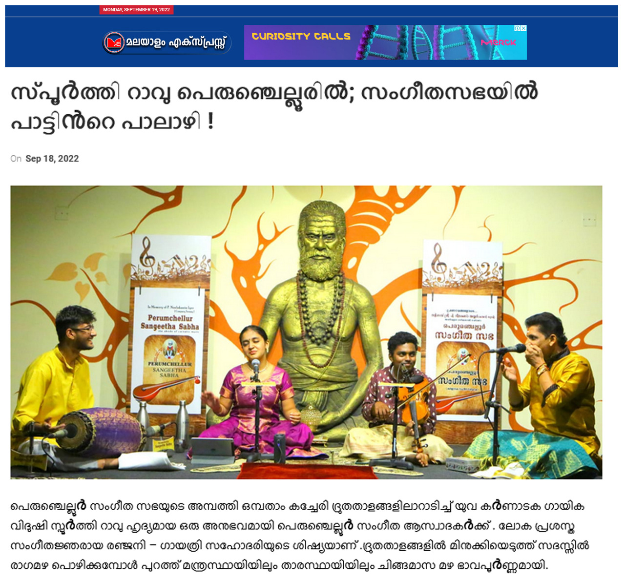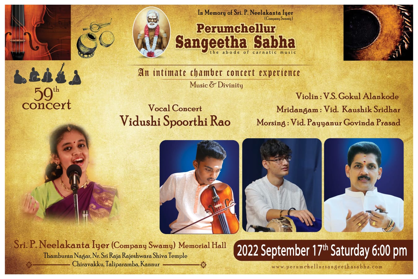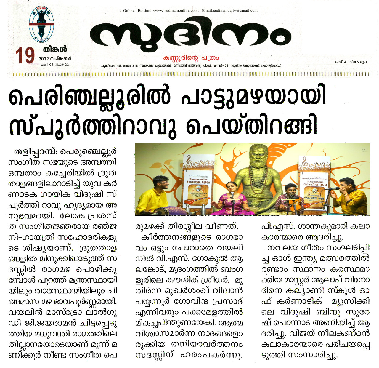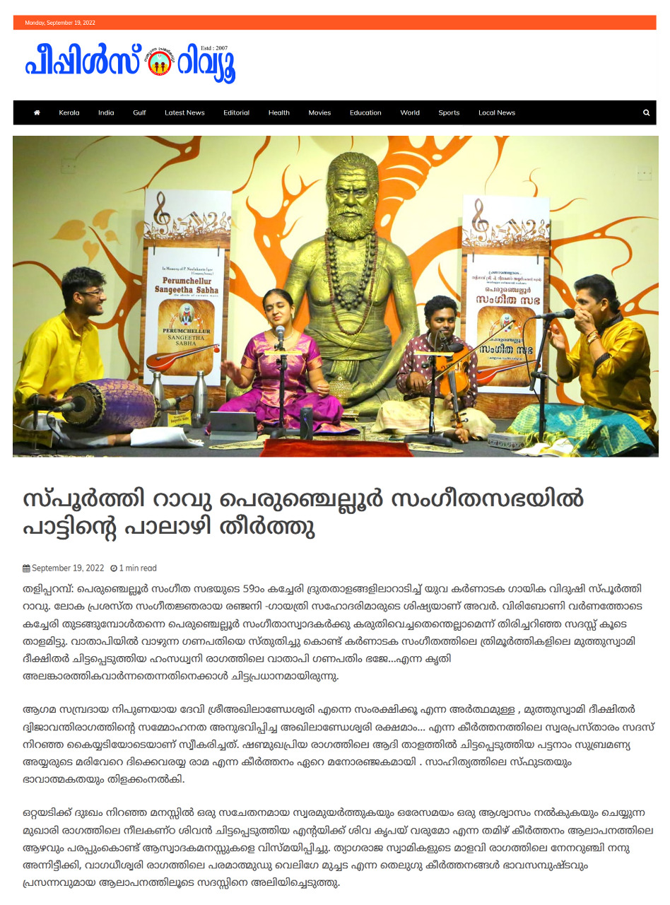 പെരുഞ്ചെല്ലൂർ സംഗീത സഭയുടെ അമ്പത്തി ഒമ്പതാം കച്ചേരി ദ്രുതതാളങ്ങളിലാറാടിച്ച് യുവ കർണാടക ഗായിക വിദുഷി സ്പൂർത്തി റാവു ഹൃദ്യമായ ഒരു അനുഭവമായി പെരുഞ്ചെല്ലൂർ സംഗീത ആസ്വാദകർക്ക് . ലോക പ്രശസ്ത സംഗീതജ്ഞരായ രഞ്ജനി - ഗായത്രി സഹോദരിയുടെ ശിഷ്യയാണ് . ദ്രുതതാളങ്ങളില് മിനുക്കിയെടുത്ത് സദസ്സില് രാഗമഴ പൊഴിക്കുമ്പോള് പുറത്ത് മന്ത്രസ്ഥായിയിലും താരസ്ഥായിയിലും ചിങ്ങമാസ മഴ ഭാവപൂർണ്ണമായി. വിരിബോണി വര്ണത്തോടെ കച്ചേരി തുടങ്ങുമ്പോള്തന്നെ പെരുഞ്ചെല്ലൂർ സംഗീതാസ്വാദകർക്കു കരുതിവെച്ചതെന്തെല്ലാമെന്ന് തിരിച്ചറിഞ്ഞ സദസ്സ് കൂടെ താളമിട്ടു. വാതാപിയിൽ വാഴുന്ന ഗണപതിയെ സ്തുതിച്ചു കൊണ്ട് കർണ്ണാടക സംഗീതത്തിലെ ത്രിമൂർത്തികളിലെ മുത്തുസ്വാമി ദീക്ഷിതർ ചിട്ടപ്പെടുത്തിയ ഹംസധ്വനി രാഗത്തിലെ വാതാപി ഗണപതിം ഭജേ...എന്ന കൃതി അലങ്കാരത്തികവാര്ന്നതെന്നതിനെക്കാള് ചിട്ടപ്രധാനമായിരുന്നു. ആഗമ സമ്പ്രദായ നിപുണയായ ദേവി ശ്രീ അഖിലാണ്ഡേശ്വരി എന്നെ സംരക്ഷിക്കൂ എന്ന അർത്ഥമുള്ള , മുത്തുസ്വാമി ദീക്ഷിതർ ദ്വിജാവന്തിരാഗത്തിന്റെ സമ്മോഹനത അനുഭവിപ്പിച്ച അഖിലാണ്ഡേശ്വരി രക്ഷമാം... എന്ന കീര്ത്തനത്തിലെ സ്വരപ്രസ്താരം സദസ്സ് നിറഞ്ഞ കയ്യടിയോടെയാണ് സ്വീകരിച്ചത്. ഷണ്മുഖപ്രിയ രാഗത്തിലെ ആദി താളത്തിൽ ചിട്ടപ്പെടുത്തിയ പട്ടനാം സുബ്രമണ്യ അയ്യരുടെ മരിവേറെ ദിക്കെവരയ്യ രാമ എന്ന കീർത്തനം ഏറെ മനോരഞ്ജകമായി . സാഹിത്യത്തിലെ സ്ഫുടതയും ഭാവാത്മകതയും തിളക്കംനല്കി. ഒറ്റയടിക്ക് ദുഃഖം നിറഞ്ഞ മനസ്സിൽ ഒരു സചേതനമായ സ്വരമുയർത്തുകയും ഒരേസമയം ഒരു ആശ്വാസം നൽകുകയും ചെയ്യുന്ന മുഖാരി രാഗത്തിലെ നീലകണ്ഠ ശിവൻ ചിട്ടപ്പെടുത്തിയ എൻറയിക്ക് ശിവ കൃപയ് വരുമോ എന്ന തമിഴ് കീർത്തനം ആലാപനത്തിലെ ആഴവും പരപ്പുംകൊണ്ട് ആസ്വാദകമനസ്സുകളെ വിസ്മയിപ്പിച്ചു. ത്യാഗരാജ സ്വാമികളുടെ മാളവി രാഗത്തിലെ നേനറുഞ്ചി നനു അന്നിട്ടീക്കി, വാഗധീശ്വരി രാഗത്തിലെ പരമാത്മുഡു വെലിഗേ മുച്ചട എന്ന തെലുഗു കീർത്തനങ്ങൾ ഭാവസമ്പുഷ്ടവും പ്രസന്നവുമായ ആലാപനത്തിലൂടെ സദസ്സിനെ അലിയിച്ചെടുത്തു. ആഹിർഭൈരവ് രാഗത്തിലെ 'രഘുവര തുമകൊ മേരി ലാജ് ' എന്ന ഭജൻ കേള്വിക്ക് ശീതളാനുഭവം പകരുന്നതായിരുന്നു . വയലിൻ മാസ്ട്രോ ലാൽഗുഡി ജി.ജയരാമൻ ചിട്ടപ്പെടുത്തിയ മധുവന്തി രാഗത്തിലെ തില്ലാനയോടെയാണ് മൂന്ന് മണിക്കൂർ നീണ്ട സംഗീത പെരുമഴക്ക് തിരശ്ശീല വീണത്. കീര്ത്തനങ്ങളുടെ രാഗഭാവം ഒട്ടും ചോരാതെ വയലിനില് വി . എസ് . ഗോകുൽ ആലങ്കോട് , മൃദംഗത്തിൽ ബംഗളൂരിലെ കൗശിക് ശ്രീധർ, മുതിർന്ന മുഖര്ശംഖ് വിദ്വാൻ പയ്യന്നൂർ ഗോവിന്ദ പ്രസാദ് എന്നിവരും പക്കമേളത്തില് മികച്ചപിന്തുണയേകി. ആത്മവിശ്വാസമാര്ന്ന നാദങ്ങളൊരുക്കിയ തനിയാവർത്തനം സദസ്സിന് ഹരംപകര്ന്നു. പി .എസ് . ശാന
