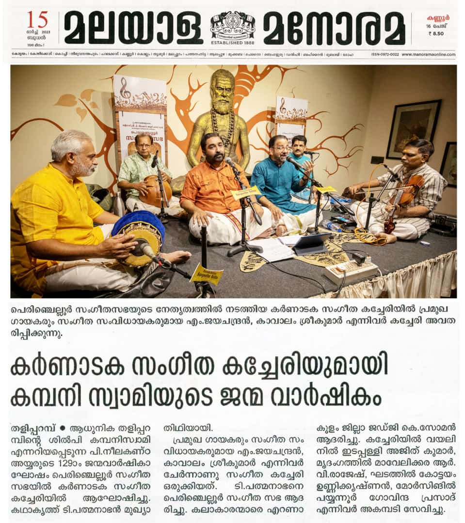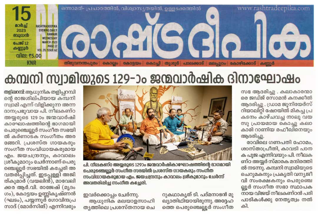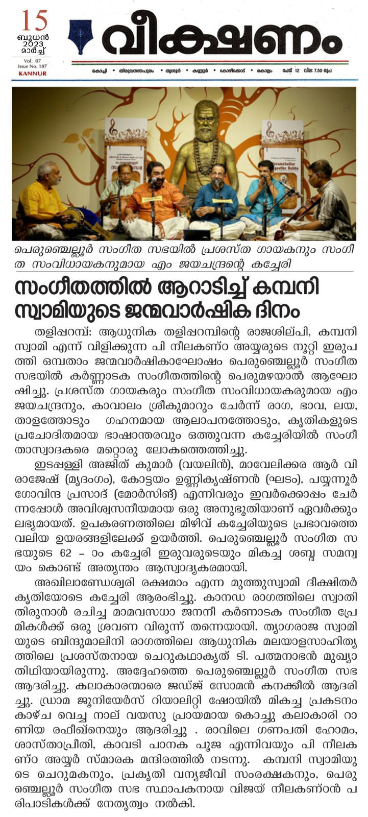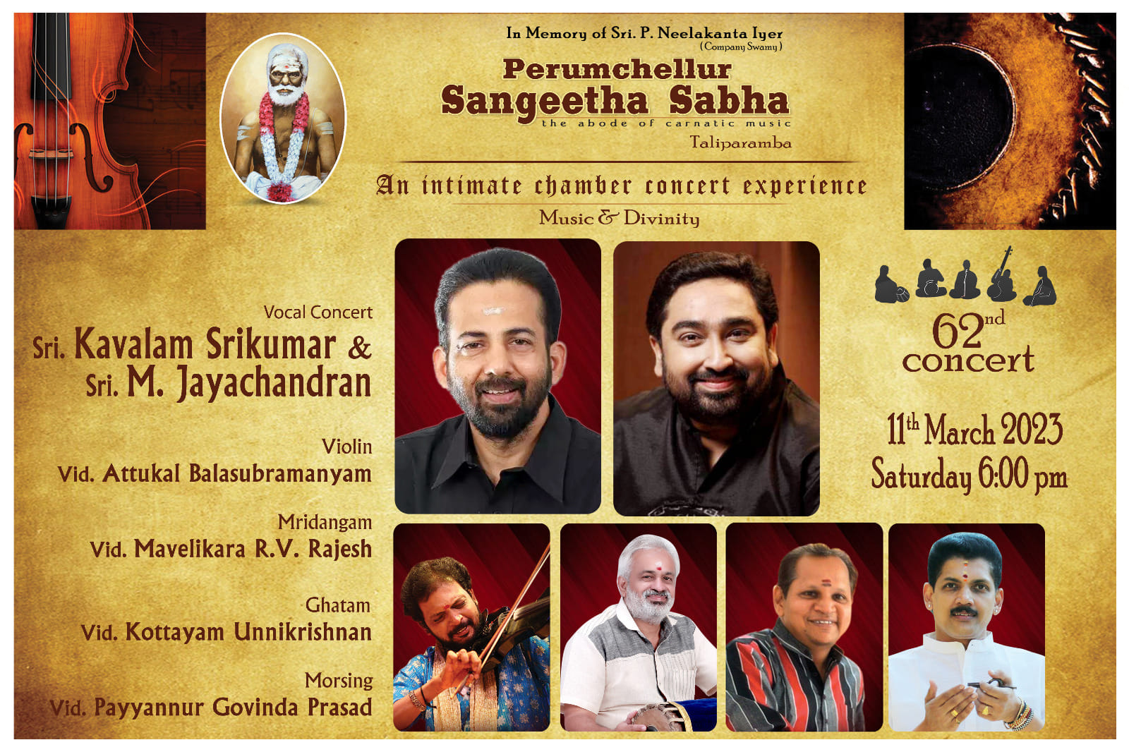 ആധുനിക തളിപ്പറമ്പിന്റെ രാജശില്പിയും ആദരവോടെ കമ്പനിസ്വാമി എന്ന് വിളിക്കുന്ന അന്നദാനപ്രഭുവായ ശ്രീ. പി. നീലകണ്ഠ അയ്യരുടെ നൂറ്റി ഇരുപത്തി ഒമ്പതാം ജന്മവാർഷികാഘോഷം പെരുഞ്ചെല്ലൂർ സംഗീത സഭയിൽ കർണ്ണാടക സംഗീതത്തിന്റെ പെരുമഴയാൽ ആഘോഷിച്ചു. പ്രശസ്ത ഗായകരും സംഗീത സംവിധായകരുമായ എം . ജയചന്ദ്രനും, കാവാലം ശ്രീകുമാറും ചേർന്ന് രാഗ, ഭാവ, ലയ, താളത്തോടും ഗഹനമായ ആലാപനത്തോടും, കൃതികളുടെ പ്രചോദിതമായ ഭാഷാന്തരവും ഒത്തുവന്ന കച്ചേരിയിൽ സംഗീതാസ്വാദകരെ മറ്റൊരു ലോകത്തെത്തിച്ചു. ഇടപ്പള്ളി അജിത് കുമാർ (വയലിൻ), മാവേലിക്കര ആർ വി രാജേഷ് (മൃദംഗം), കോട്ടയം ഉണ്ണികൃഷ്ണൻ (ഘടം), പയ്യന്നൂർ ഗോവിന്ദ പ്രസാദ് (മോർസിങ്) എന്നിവരും ഇവർക്കൊപ്പം ചേർന്നപ്പോൾ അവിശ്വസനീയമായ ഒരു അനുഭൂതിയാണ് ഏവർക്കും ലഭ്യമായത്. ഉപകരണത്തിലെ മിഴിവ് കച്ചേരിയുടെ പ്രഭാവത്തെ വലിയ ഉയരങ്ങളിലേക്ക് ഉയർത്തി. പെരുഞ്ചെല്ലൂർ സംഗീത സഭയുടെ 62 - ആം കച്ചേരി ഇരുവരുടെയും മികച്ച ശബ്ദ സമന്വയം കൊണ്ട് അത്യന്തം ആസ്വാദ്യകരമായി.