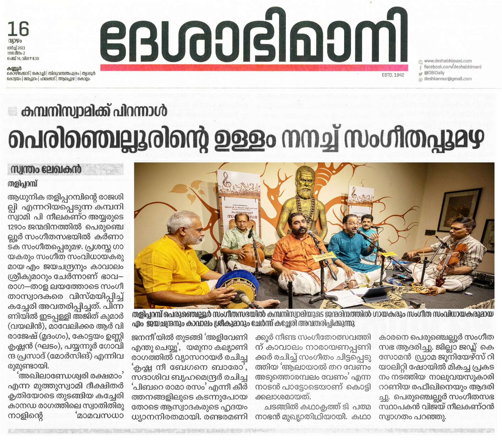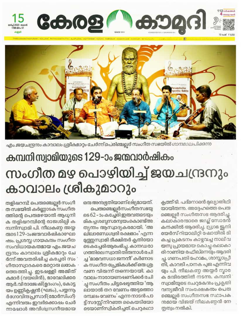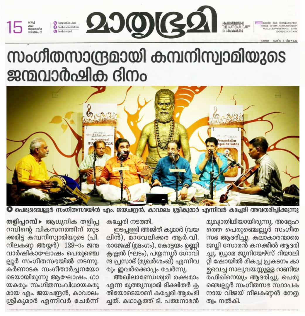ആധുനിക തളിപ്പറമ്പിന്റെ രാജശില്പിയും ആദരവോടെ കമ്പനിസ്വാമി എന്ന് വിളിക്കുന്ന അന്നദാനപ്രഭുവായ ശ്രീ. പി. നീലകണ്ഠ അയ്യരുടെ നൂറ്റി ഇരുപത്തി ഒമ്പതാം ജന്മവാർഷികാഘോഷം പെരുഞ്ചെല്ലൂർ സംഗീത സഭയിൽ കർണ്ണാടക സംഗീതത്തിന്റെ പെരുമഴയാൽ ആഘോഷിച്ചു. പ്രശസ്ത ഗായകരും സംഗീത സംവിധായകരുമായ എം . ജയചന്ദ്രനും, കാവാലം ശ്രീകുമാറും ചേർന്ന് രാഗ, ഭാവ, ലയ, താളത്തോടും ഗഹനമായ ആലാപനത്തോടും, കൃതികളുടെ പ്രചോദിതമായ ഭാഷാന്തരവും ഒത്തുവന്ന കച്ചേരിയിൽ സംഗീതാസ്വാദകരെ മറ്റൊരു ലോകത്തെത്തിച്ചു. ഇടപ്പള്ളി അജിത് കുമാർ (വയലിൻ), മാവേലിക്കര ആർ വി രാജേഷ് (മൃദംഗം), കോട്ടയം ഉണ്ണികൃഷ്ണൻ (ഘടം), പയ്യന്നൂർ ഗോവിന്ദ പ്രസാദ് (മോർസിങ്) എന്നിവരും ഇവർക്കൊപ്പം ചേർന്നപ്പോൾ അവിശ്വസനീയമായ ഒരു അനുഭൂതിയാണ് ഏവർക്കും ലഭ്യമായത്. ഉപകരണത്തിലെ മിഴിവ് കച്ചേരിയുടെ പ്രഭാവത്തെ വലിയ ഉയരങ്ങളിലേക്ക് ഉയർത്തി. പെരുഞ്ചെല്ലൂർ സംഗീത സഭയുടെ 62 - ആം കച്ചേരി ഇരുവരുടെയും മികച്ച ശബ്ദ സമന്വയം കൊണ്ട് അത്യന്തം ആസ്വാദ്യകരമായി.