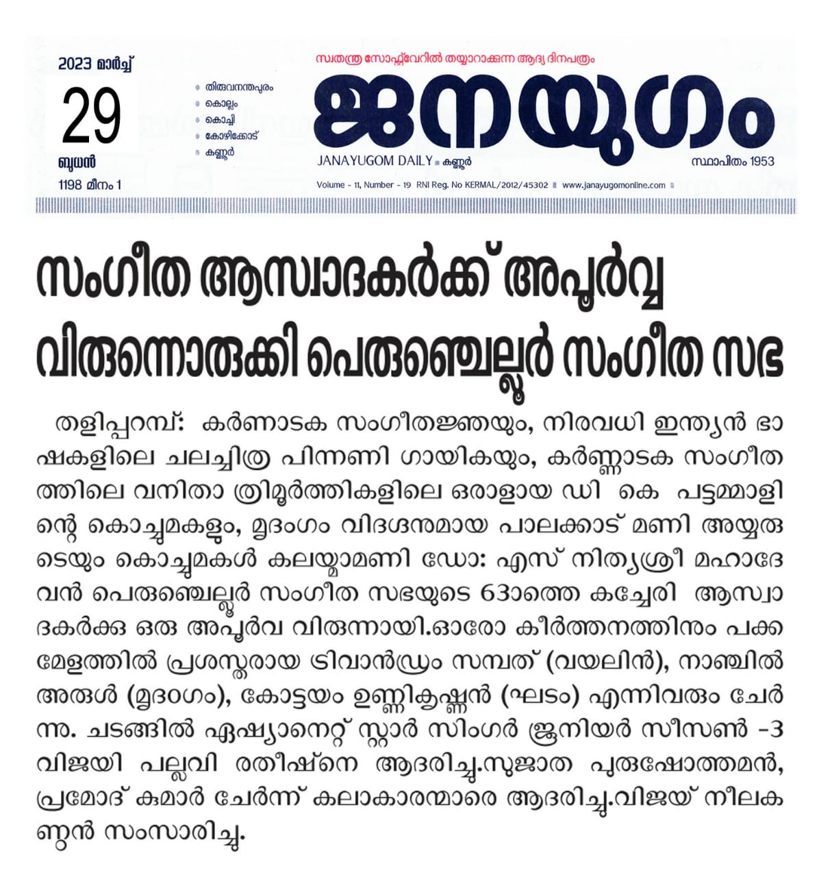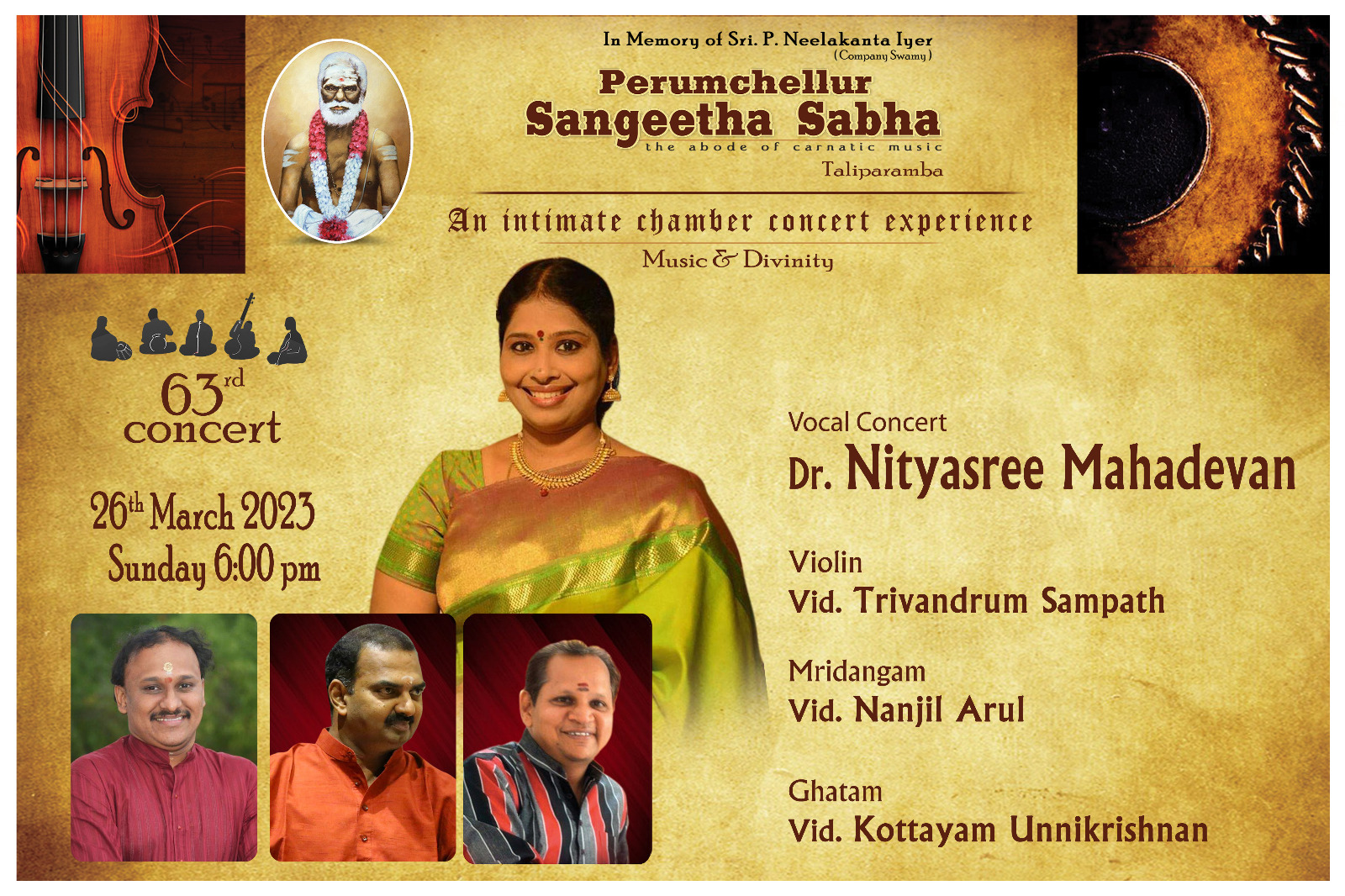 മൃദംഗം വിദഗ്ദനായ പാലക്കാട് മണി അയ്യരുടെയും കൊച്ചുമകൾ കലയ്മാമണി ഡോ. യസ്. നിത്യശ്രീ മഹാദേവൻ പെരുഞ്ചെല്ലൂർ സംഗീത സഭയുടെ 63 ത്തെ കച്ചേരി ഭക്തിയോടും ഉത്സാഹത്തോടും നന്ദിയോടും കൂടി കേട്ടിരുന്ന ആസ്വാദകർക്കു ഒരു അപൂർവ വിരുന്നായി.