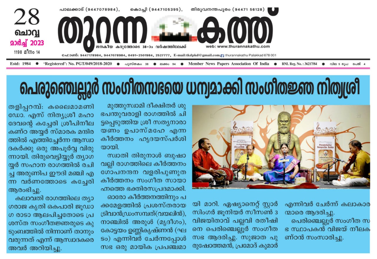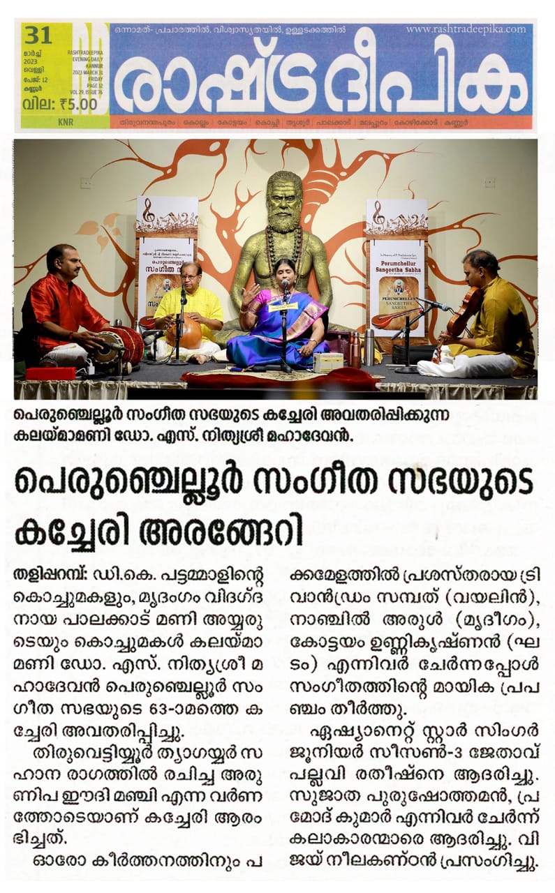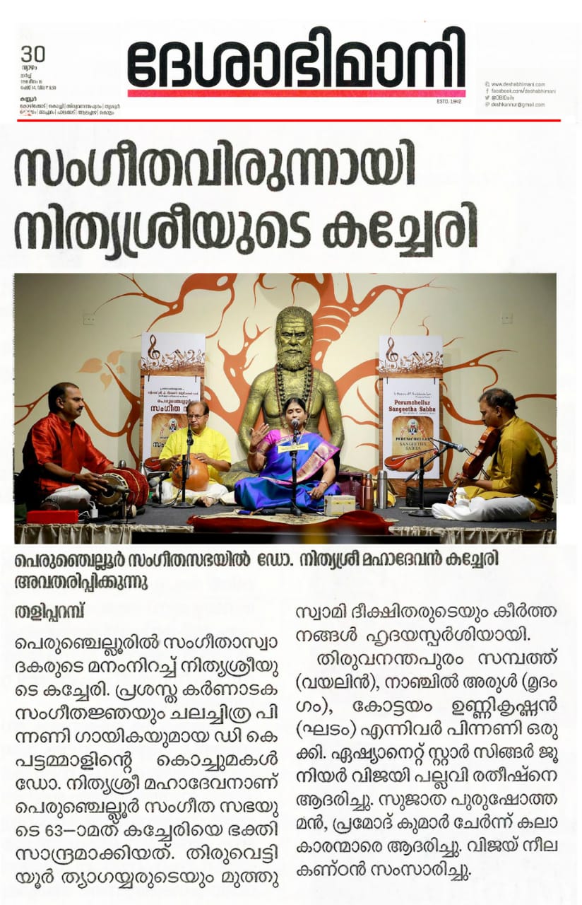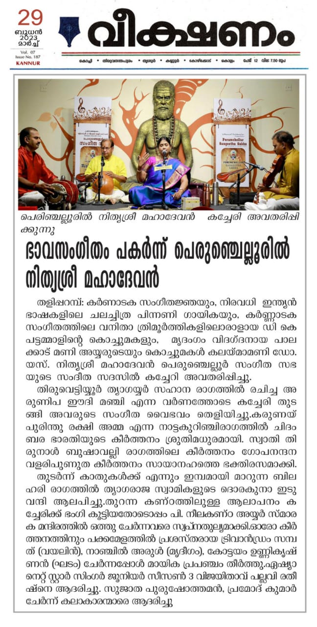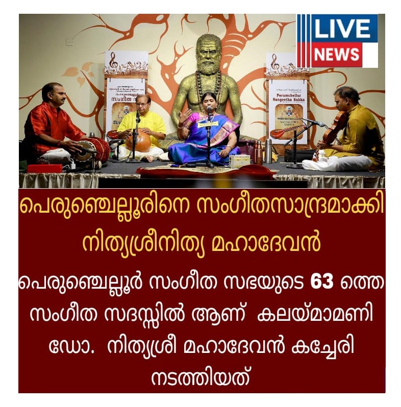 അതുല്യ ശബ്ദത്തിന്റെ അനുഗ്രഹീത കലാകാരി നിത്യശ്രീ മഹാദേവൻ നിഗൂഢമായ ഒരു ആത്മീയ സംതൃപ്തി പെരുഞ്ചെല്ലൂരിലെ ശുദ്ധ സംഗീത പ്രേമികൾക്ക് നല്കി.