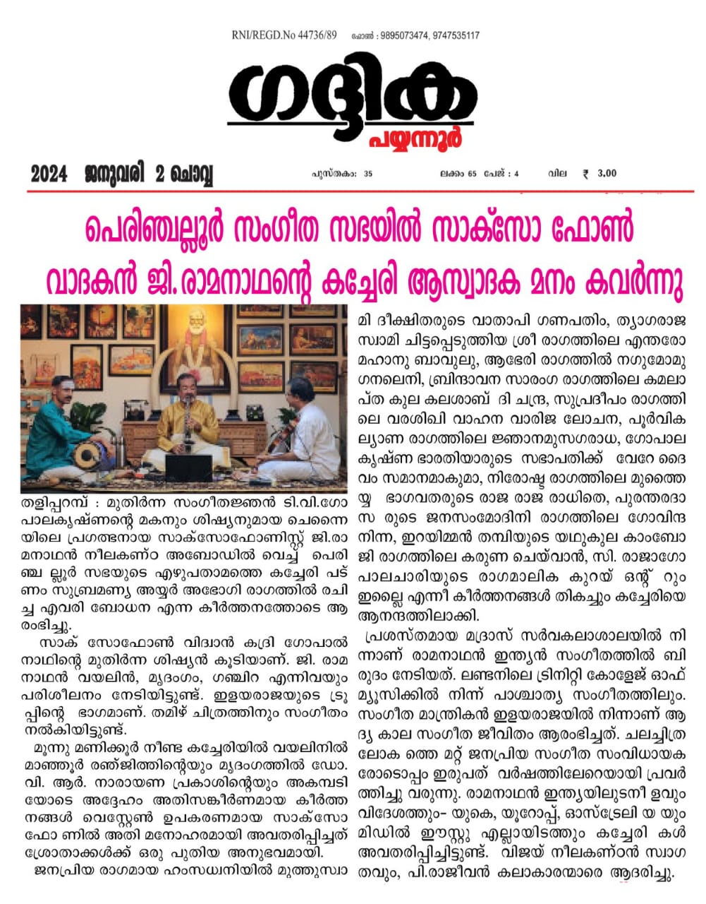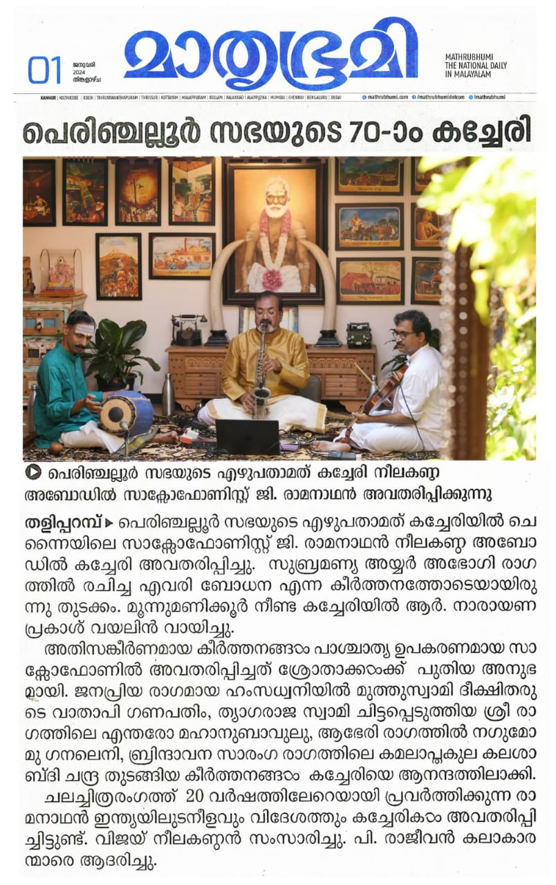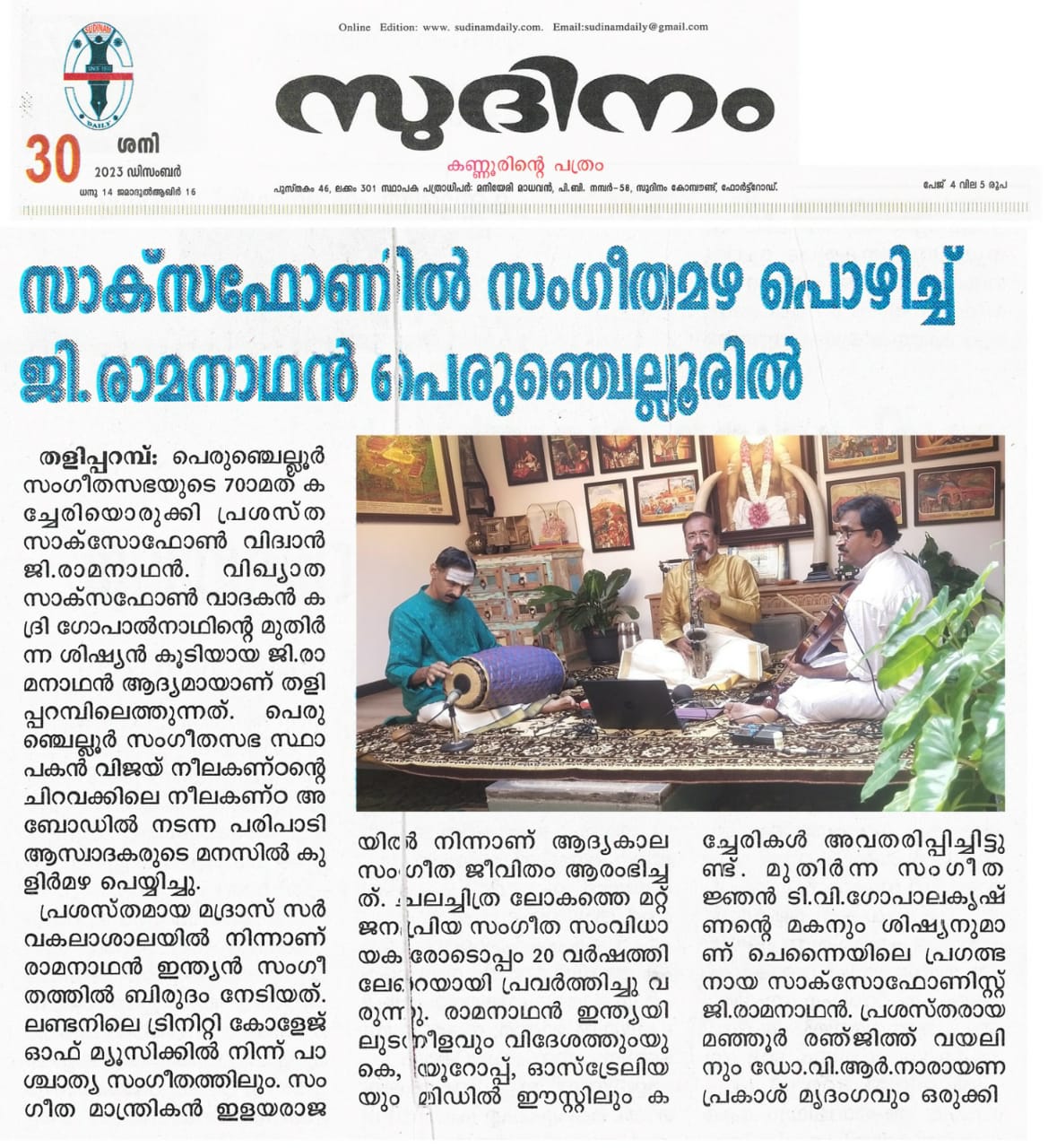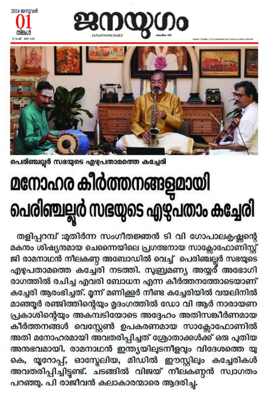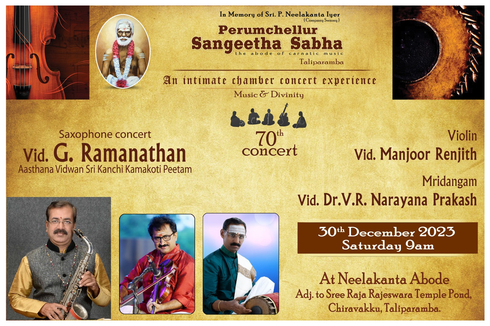 തളിപ്പറമ്പ് : മുതിർന്ന സംഗീതജ്ഞൻ ടി.വി.ഗോപാലകൃഷ്ണന്റെ മകനും ശിഷ്യനുമായ ചെന്നൈയിലെ പ്രഗത്ഭനായ സാക്സോഫോണിസ്റ്റ് ജി.രാമനാഥൻ നീലകണ്ഠ അബോഡിൽ വെച്ച് പെരിഞ്ചല്ലൂർ സഭയുടെ എഴുപതാമത്തെ കച്ചേരി പട്ണം സുബ്രമണ്യ അയ്യർ അഭോഗി രാഗത്തിൽ രചിച്ച എവരി ബോധന എന്ന കീർത്തനത്തോടെ ആരംഭിച്ചു. സാക്സോഫോൺ വിദ്വാൻ കദ്രി ഗോപാൽനാഥിന്റെ മുതിർന്ന ശിഷ്യൻ കൂടിയാണ്. ജി. രാമനാഥൻ വയലിൻ, മൃദംഗം, ഗഞ്ചിറ എന്നിവയും പരിശീലനം നേടിയിട്ടുണ്ട്. ഇളയരാജയുടെ ട്രൂപ്പിന്റെ ഭാഗമാണ്. തമിഴ് ചിത്രത്തിനും സംഗീതം നൽകിയിട്ടുണ്ട്. മൂന്ന്വ മണിക്കൂർ നീണ്ട കച്ചേരിയിൽ വയലിനിൽ മാഞ്ഞൂർ രഞ്ജിത്തിന്റെയും മൃദംഗത്തിൽ ഡോ.വി. ആർ. നാരായണ പ്രകാശിന്റെയും അകമ്പടിയോടെ അദ്ദേഹം അതിസങ്കീർണമായ കീർത്തനങ്ങൾ വെസ്റ്റേൺ ഉപകരണമായ സാക്സോഫോണിൽ അതി മനോഹരമായി അവതരിപ്പിച്ചത് ശ്രോതാക്കൾക്ക് ഒരു പുതിയ അനുഭമായി. ജനപ്രിയ രാഗമായ ഹംസധ്വനിയിൽ മുത്തുസ്വാമി ദീക്ഷിതരുടെ വാതാപി ഗണപതിം, ത്യാഗരാജ സ്വാമി ചിട്ടപ്പെടുത്തിയ ശ്രീ രാഗത്തിലെ എന്തരോ മഹാനു ബാവുലു, ആഭേരി രാഗത്തിൽ നഗുമോമു ഗനലെനി, ബ്രിന്ദാവന സാരംഗ രാഗത്തിലെ കമലാപ്തകുല കലശാബ്ദി ചന്ദ്ര, സുപ്രദീപം രാഗത്തിലെ വരശിഖി വാഹന വാരിജ ലോചന, പൂർവികല്യാണ രാഗത്തിലെ ജ്ഞാനമുസഗരാധ, ഗോപാലകൃഷ്ണ ഭാരതിയാരുടെ സഭാപതിക്ക് വേറേ ദൈവം സമാനമാകുമാ, നിരോഷ്ട രാഗത്തിലെ മുത്തൈയ്യ ഭാഗവതരുടെ രാജ രാജ രാധിതെ, പുരന്തരദാസരുടെ ജനസംമോദിനി രാഗത്തിലെ ഗോവിന്ദ നിന്ന, ഇറയിമ്മൻ തമ്പിയുടെ യഥുകുല കാംബോജി രാഗത്തിലെ കരുണ ചെയ്വാൻ, സി. രാജാഗോപാലചാരിയുടെ രാഗമാലിക കുറയ് ഒന്റ്റും ഇല്ലൈ എന്നീ കീർത്തനങ്ങൾ തികച്ചും കച്ചേരിയെ ആനന്ദത്തിലാക്കി. പ്രശസ്തമായ മദ്രാസ് സർവകലാശാലയിൽ നിന്നാണ് രാമനാഥൻ ഇന്ത്യൻ സംഗീതത്തിൽ ബിരുദം നേടിയത്. ലണ്ടനിലെ ട്രിനിറ്റി കോളേജ് ഓഫ് മ്യൂസിക്കിൽ നിന്ന് പാശ്ചാത്യ സംഗീതത്തിലും. സംഗീത മാന്ത്രികൻ ഇളയരാജയിൽ നിന്നാണ് ആദ്യകാല സംഗീത ജീവിതം ആരംഭിച്ചത്. ചലച്ചിത്ര ലോകത്തെ മറ്റ് ജനപ്രിയ സംഗീത സംവിധായകരോടൊപ്പം 20 വർഷത്തിലേറെയായി പ്രവർത്തിച്ചു വരുന്നു. രാമനാഥൻ ഇന്ത്യയിലുടനീളവും വിദേശത്തും- യുകെ, യൂറോപ്പ്, ഓസ്ട്രേലിയയും മിഡിൽ ഈസ്റ്റു എല്ലായിടത്തും കച്ചേരികൾ അവതരിപ്പിച്ചിട്ടുണ്ട്. വിജയ് നീലകണ്ഠൻ സ്വാഗതവും, കെ.പി.രാജീവൻ കലാകാരന്മാരെ ആദരിച്ചു.