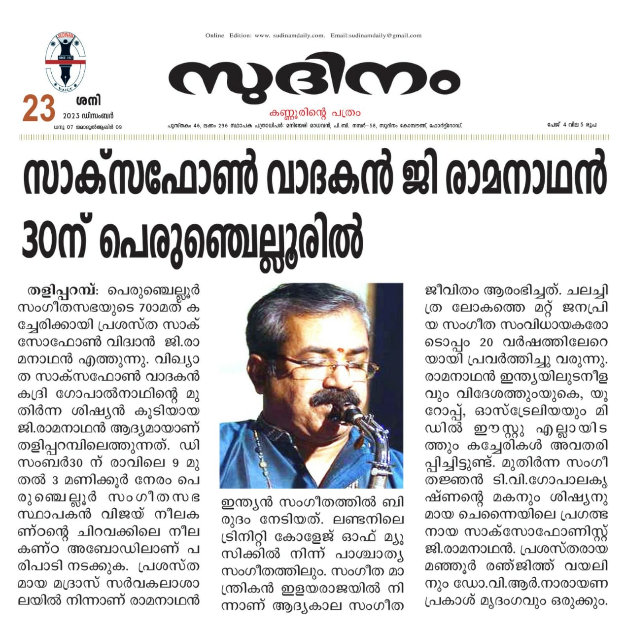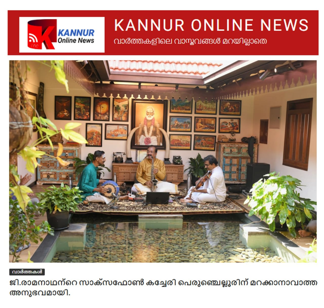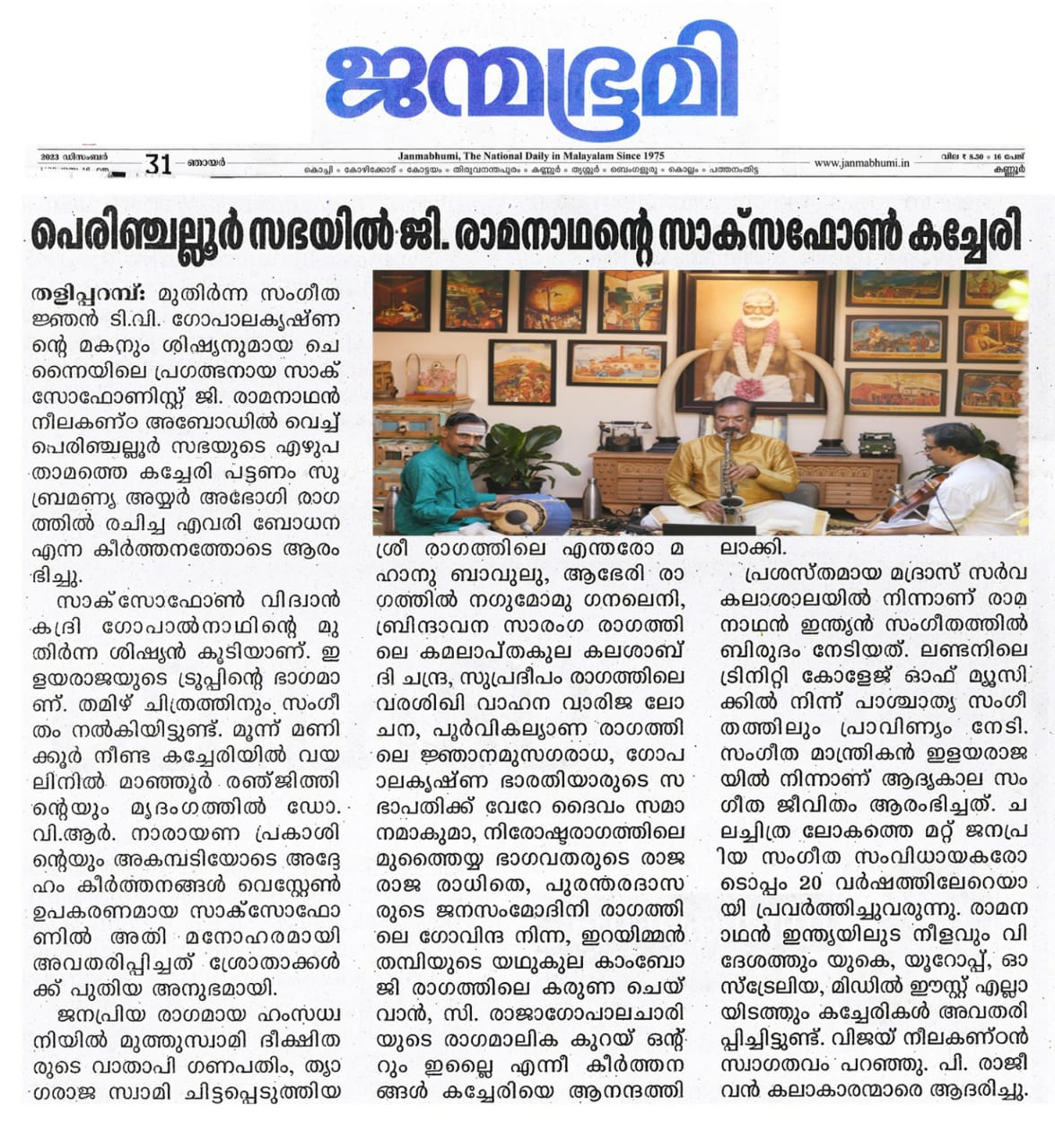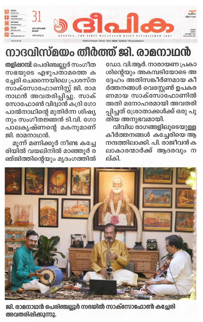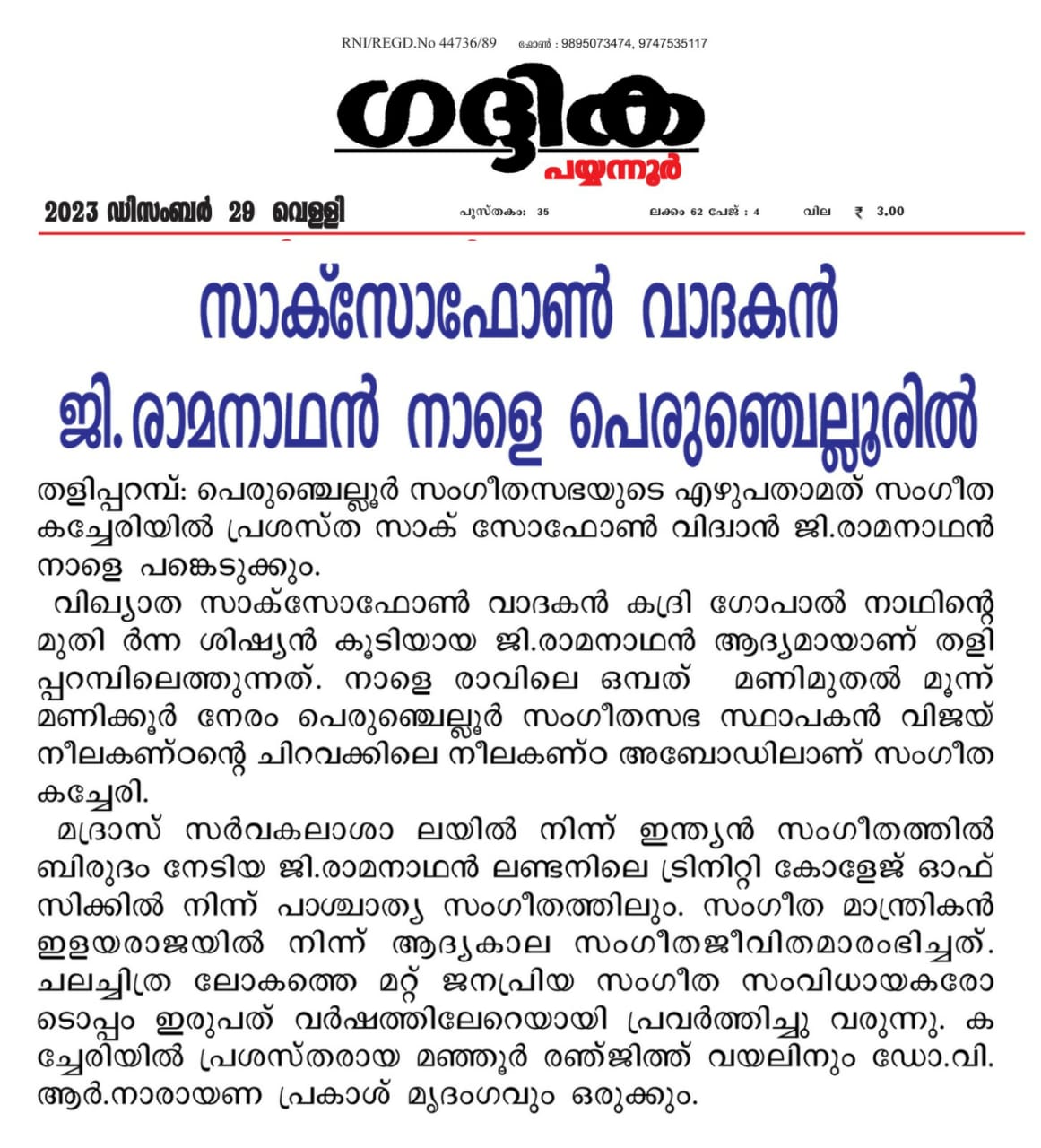 തളിപ്പറമ്പ് : മുതിർന്ന സംഗീതജ്ഞൻ ടി.വി.ഗോപാലകൃഷ്ണന്റെ മകനും ശിഷ്യനുമായ ചെന്നൈയിലെ പ്രഗത്ഭനായ സാക്സോഫോണിസ്റ്റ് ജി.രാമനാഥൻ നീലകണ്ഠ അബോഡിൽ വെച്ച് പെരിഞ്ചല്ലൂർ സഭയുടെ എഴുപതാമത്തെ കച്ചേരി പട്ണം സുബ്രമണ്യ അയ്യർ അഭോഗി രാഗത്തിൽ രചിച്ച എവരി ബോധന എന്ന കീർത്തനത്തോടെ ആരംഭിച്ചു. സാക്സോഫോൺ വിദ്വാൻ കദ്രി ഗോപാൽനാഥിന്റെ മുതിർന്ന ശിഷ്യൻ കൂടിയാണ്. ജി. രാമനാഥൻ വയലിൻ, മൃദംഗം, ഗഞ്ചിറ എന്നിവയും പരിശീലനം നേടിയിട്ടുണ്ട്. ഇളയരാജയുടെ ട്രൂപ്പിന്റെ ഭാഗമാണ്. തമിഴ് ചിത്രത്തിനും സംഗീതം നൽകിയിട്ടുണ്ട്. മൂന്ന്വ മണിക്കൂർ നീണ്ട കച്ചേരിയിൽ വയലിനിൽ മാഞ്ഞൂർ രഞ്ജിത്തിന്റെയും മൃദംഗത്തിൽ ഡോ.വി. ആർ. നാരായണ പ്രകാശിന്റെയും അകമ്പടിയോടെ അദ്ദേഹം അതിസങ്കീർണമായ കീർത്തനങ്ങൾ വെസ്റ്റേൺ ഉപകരണമായ സാക്സോഫോണിൽ അതി മനോഹരമായി അവതരിപ്പിച്ചത് ശ്രോതാക്കൾക്ക് ഒരു പുതിയ അനുഭമായി. ജനപ്രിയ രാഗമായ ഹംസധ്വനിയിൽ മുത്തുസ്വാമി ദീക്ഷിതരുടെ വാതാപി ഗണപതിം, ത്യാഗരാജ സ്വാമി ചിട്ടപ്പെടുത്തിയ ശ്രീ രാഗത്തിലെ എന്തരോ മഹാനു ബാവുലു, ആഭേരി രാഗത്തിൽ നഗുമോമു ഗനലെനി, ബ്രിന്ദാവന സാരംഗ രാഗത്തിലെ കമലാപ്തകുല കലശാബ്ദി ചന്ദ്ര, സുപ്രദീപം രാഗത്തിലെ വരശിഖി വാഹന വാരിജ ലോചന, പൂർവികല്യാണ രാഗത്തിലെ ജ്ഞാനമുസഗരാധ, ഗോപാലകൃഷ്ണ ഭാരതിയാരുടെ സഭാപതിക്ക് വേറേ ദൈവം സമാനമാകുമാ, നിരോഷ്ട രാഗത്തിലെ മുത്തൈയ്യ ഭാഗവതരുടെ രാജ രാജ രാധിതെ, പുരന്തരദാസരുടെ ജനസംമോദിനി രാഗത്തിലെ ഗോവിന്ദ നിന്ന, ഇറയിമ്മൻ തമ്പിയുടെ യഥുകുല കാംബോജി രാഗത്തിലെ കരുണ ചെയ്വാൻ, സി. രാജാഗോപാലചാരിയുടെ രാഗമാലിക കുറയ് ഒന്റ്റും ഇല്ലൈ എന്നീ കീർത്തനങ്ങൾ തികച്ചും കച്ചേരിയെ ആനന്ദത്തിലാക്കി. പ്രശസ്തമായ മദ്രാസ് സർവകലാശാലയിൽ നിന്നാണ് രാമനാഥൻ ഇന്ത്യൻ സംഗീതത്തിൽ ബിരുദം നേടിയത്. ലണ്ടനിലെ ട്രിനിറ്റി കോളേജ് ഓഫ് മ്യൂസിക്കിൽ നിന്ന് പാശ്ചാത്യ സംഗീതത്തിലും. സംഗീത മാന്ത്രികൻ ഇളയരാജയിൽ നിന്നാണ് ആദ്യകാല സംഗീത ജീവിതം ആരംഭിച്ചത്. ചലച്ചിത്ര ലോകത്തെ മറ്റ് ജനപ്രിയ സംഗീത സംവിധായകരോടൊപ്പം 20 വർഷത്തിലേറെയായി പ്രവർത്തിച്ചു വരുന്നു. രാമനാഥൻ ഇന്ത്യയിലുടനീളവും വിദേശത്തും- യുകെ, യൂറോപ്പ്, ഓസ്ട്രേലിയയും മിഡിൽ ഈസ്റ്റു എല്ലായിടത്തും കച്ചേരികൾ അവതരിപ്പിച്ചിട്ടുണ്ട്. വിജയ് നീലകണ്ഠൻ സ്വാഗതവും, കെ.പി.രാജീവൻ കലാകാരന്മാരെ ആദരിച്ചു.