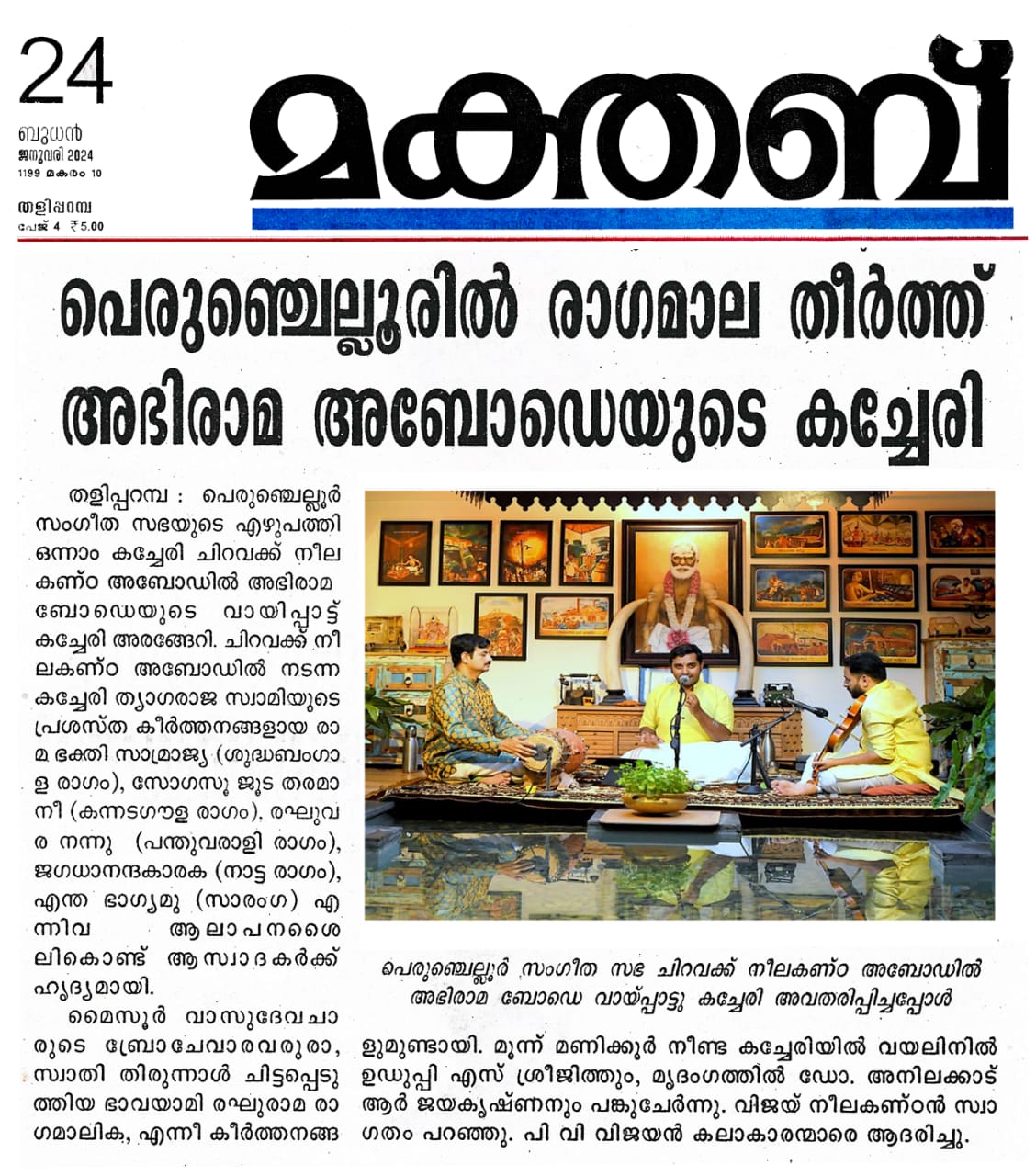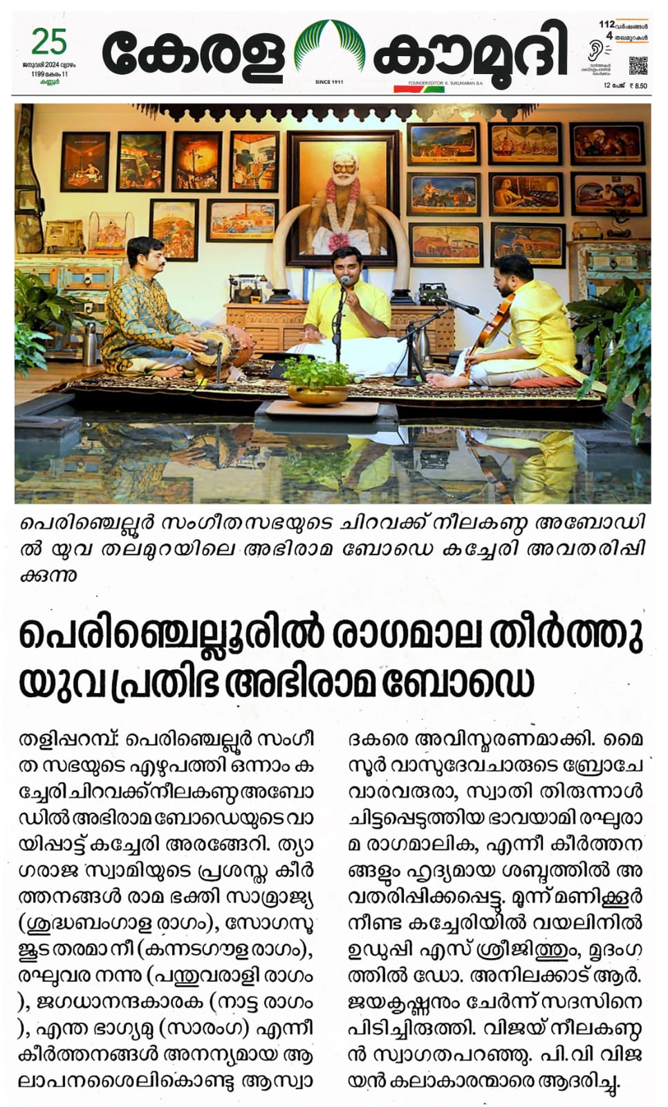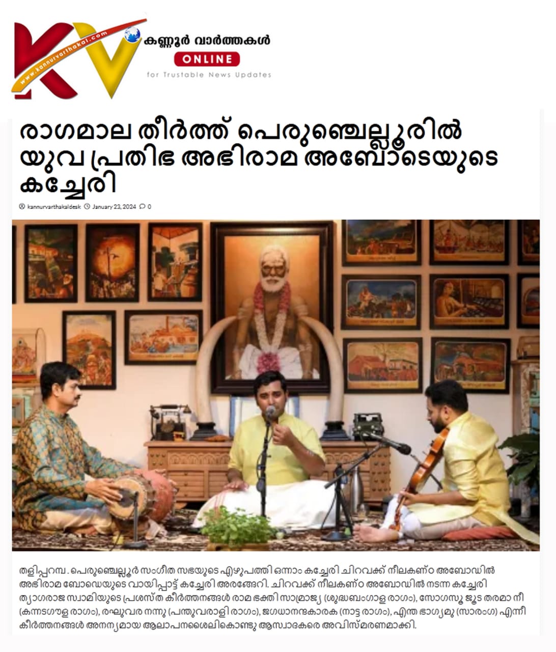 പെരുഞ്ചെല്ലൂരിൽ രാഗമാല തീർത്തു യുവ പ്രതിഭ അഭിരാമ അബോടെയുടെ ശ്രുതി മധുരമായ കച്ചേരി തളിപ്പറമ്പ : പെരുഞ്ചെല്ലൂർ സംഗീത സഭയുടെ എഴുപത്തി ഒന്നാം കച്ചേരി ചിറവക്ക് നീലകണ്ഠ അബോഡിൽ അഭിരാമ ബോഡെയുടെ വായിപ്പാട്ട് കച്ചേരി അരങ്ങേറി. ചിറവക്ക് നീലകണ്ഠ അബോഡിൽ നടന്ന കച്ചേരി ത്യാഗരാജ സ്വാമിയുടെ പ്രശസ്ത കീർത്തനങ്ങൾ രാമ ഭക്തി സാമ്രാജ്യ (ശുദ്ധബംഗാള രാഗം), സോഗസൂ ജൂട തരമാ നീ (കന്നടഗൗള രാഗം), രഘുവര നന്നു (പന്തുവരാളി രാഗം), ജഗധാനന്ദകാരക (നാട്ട രാഗം), എന്ത ഭാഗ്യമു (സാരംഗ) എന്നീ കീർത്തനങ്ങൾ അനന്യമായ ആലാപനശൈലികൊണ്ടു ആസ്വാദകരെ അവിസ്മരണമാക്കിയത്. മൈസൂർ വാസുദേവചാരുടെ ബ്രോചേവാരവരുരാ, സ്വാതി തിരുന്നാൾ ചിട്ടപ്പെടുത്തിയ ഭാവയാമി രഘുരാമ രാഗമാലിക, എന്നീ കീർത്തനങ്ങളും ഹൃദ്യമായ ശബ്ദത്തിൽ മൂന്ന് മണിക്കൂർ നീണ്ട കച്ചേരിയിൽ വയലിനിൽ ഉഡുപ്പി എസ് ശ്രീജിത്തും, മൃദംഗത്തിൽ ഡോ. അനിലക്കാട് ആർ ജയകൃഷ്ണനും ചേർന്ന് മനോധർമപരമായ ആവിഷ്ക്കാരങ്ങൾ സദസിനെ പിടിച്ചിരുത്തി. വിജയ് നീലകണ്ഠൻ സ്വാഗതവും , പി വി വിജയൻ കലാകാരന്മാരെ ആദരിച്ചു പെരുഞ്ചെല്ലൂർ സംഗീത സഭയുടെ എഴുപത്തി ഒന്നാമത്തെ കച്ചേരി ചിറവക്ക് നീലകണ്ഠ അബോഡിൽ യുവ തലമുറയിലെ അഭിരാമ ബോഡെ വായിപ്പാട്ടു കച്ചേരി അവതരിപ്പിക്കുന്നു