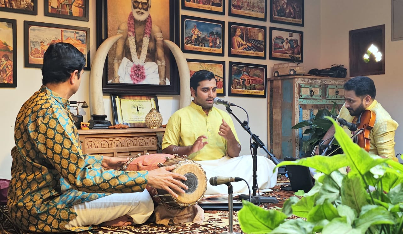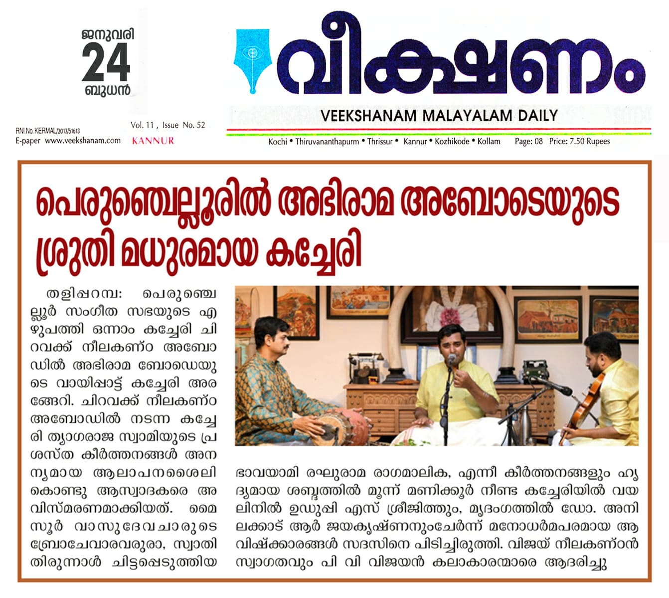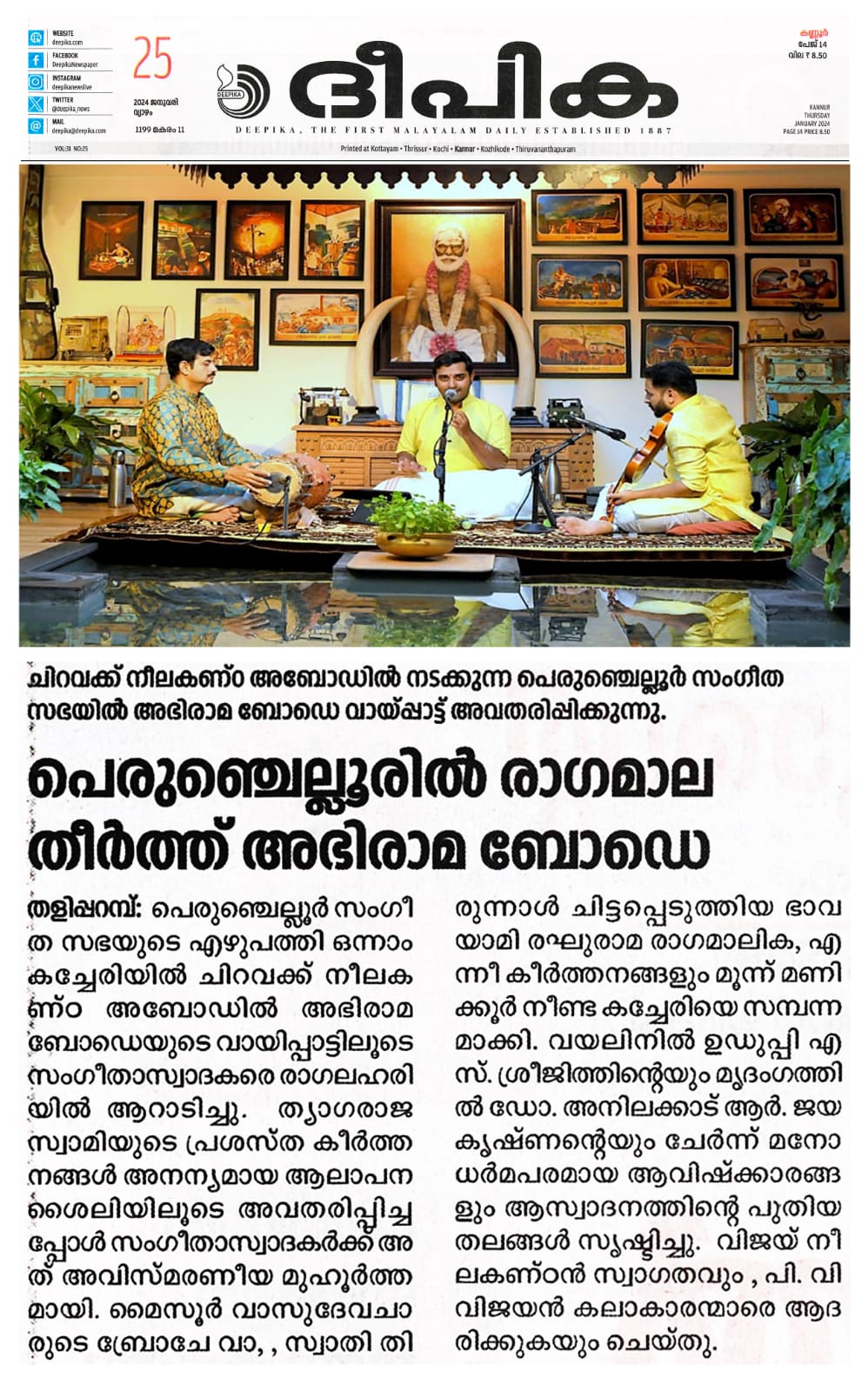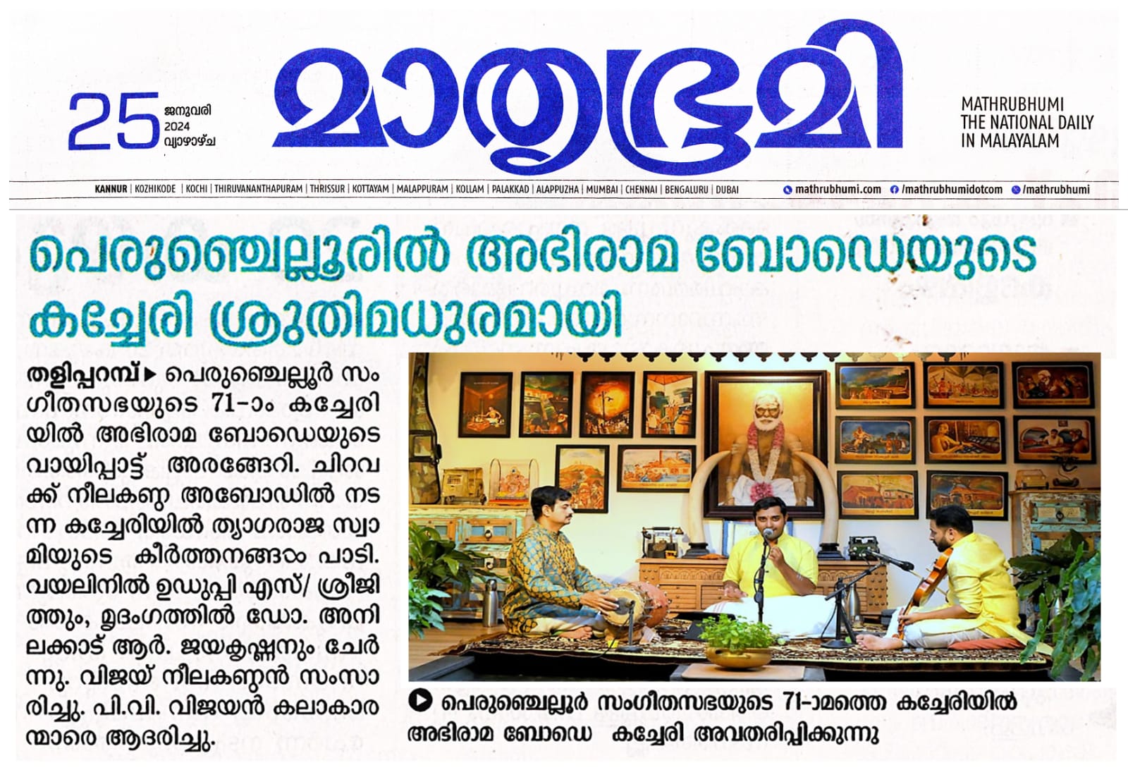 പെരുഞ്ചെല്ലൂരിൽ രാഗമാല തീർത്തു യുവ പ്രതിഭ അഭിരാമ അബോടെയുടെ ശ്രുതി മധുരമായ കച്ചേരി തളിപ്പറമ്പ : പെരുഞ്ചെല്ലൂർ സംഗീത സഭയുടെ എഴുപത്തി ഒന്നാം കച്ചേരി ചിറവക്ക് നീലകണ്ഠ അബോഡിൽ അഭിരാമ ബോഡെയുടെ വായിപ്പാട്ട് കച്ചേരി അരങ്ങേറി. ചിറവക്ക് നീലകണ്ഠ അബോഡിൽ നടന്ന കച്ചേരി ത്യാഗരാജ സ്വാമിയുടെ പ്രശസ്ത കീർത്തനങ്ങൾ രാമ ഭക്തി സാമ്രാജ്യ (ശുദ്ധബംഗാള രാഗം), സോഗസൂ ജൂട തരമാ നീ (കന്നടഗൗള രാഗം), രഘുവര നന്നു (പന്തുവരാളി രാഗം), ജഗധാനന്ദകാരക (നാട്ട രാഗം), എന്ത ഭാഗ്യമു (സാരംഗ) എന്നീ കീർത്തനങ്ങൾ അനന്യമായ ആലാപനശൈലികൊണ്ടു ആസ്വാദകരെ അവിസ്മരണമാക്കിയത്. മൈസൂർ വാസുദേവചാരുടെ ബ്രോചേവാരവരുരാ, സ്വാതി തിരുന്നാൾ ചിട്ടപ്പെടുത്തിയ ഭാവയാമി രഘുരാമ രാഗമാലിക, എന്നീ കീർത്തനങ്ങളും ഹൃദ്യമായ ശബ്ദത്തിൽ മൂന്ന് മണിക്കൂർ നീണ്ട കച്ചേരിയിൽ വയലിനിൽ ഉഡുപ്പി എസ് ശ്രീജിത്തും, മൃദംഗത്തിൽ ഡോ. അനിലക്കാട് ആർ ജയകൃഷ്ണനും ചേർന്ന് മനോധർമപരമായ ആവിഷ്ക്കാരങ്ങൾ സദസിനെ പിടിച്ചിരുത്തി. വിജയ് നീലകണ്ഠൻ സ്വാഗതവും , പി വി വിജയൻ കലാകാരന്മാരെ ആദരിച്ചു പെരുഞ്ചെല്ലൂർ സംഗീത സഭയുടെ എഴുപത്തി ഒന്നാമത്തെ കച്ചേരി ചിറവക്ക് നീലകണ്ഠ അബോഡിൽ യുവ തലമുറയിലെ അഭിരാമ ബോഡെ വായിപ്പാട്ടു കച്ചേരി അവതരിപ്പിക്കുന്നു